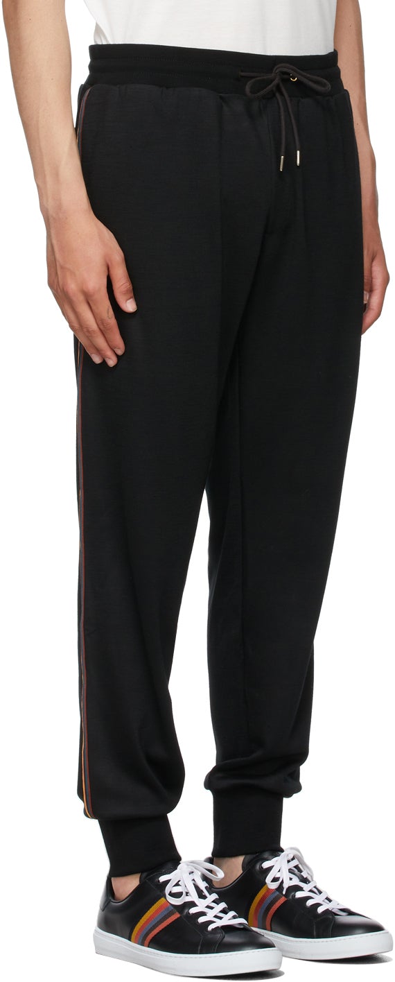Wool jersey lounge pants in black. Mid-rise. Three-pocket styling. Drawstring at elasticized rib knit waistband. Signature multicolor striped trim at outseams. Pinched seams at front. Rib knit cuffs. Mock-fly. Gold-tone hardware. Supplier color: Black 100% wool. Brand: Paul Smith