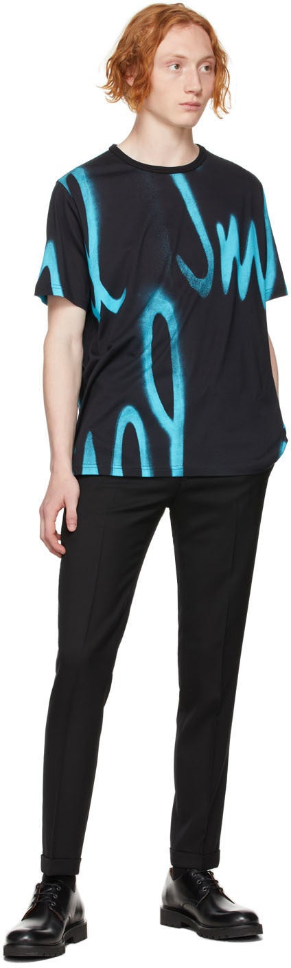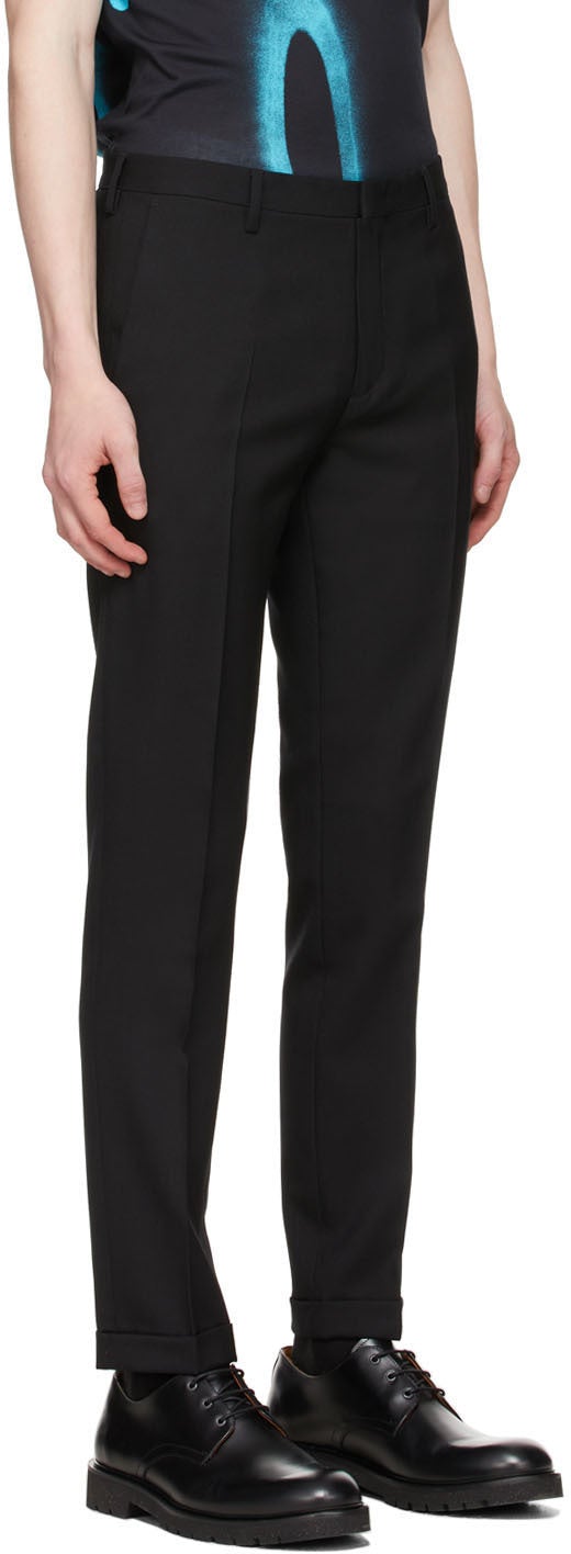 Slim-fit wool twill trousers in navy. Mid-rise. Four-pocket styling. Belt loops at waistband. Central creases at front and back. Rolled cuffs. Partial satin lining. Zip-fly. Gold-tone and silver-tone hardware. Supplier color: Dark navy 100% wool. Brand: Paul Smith
