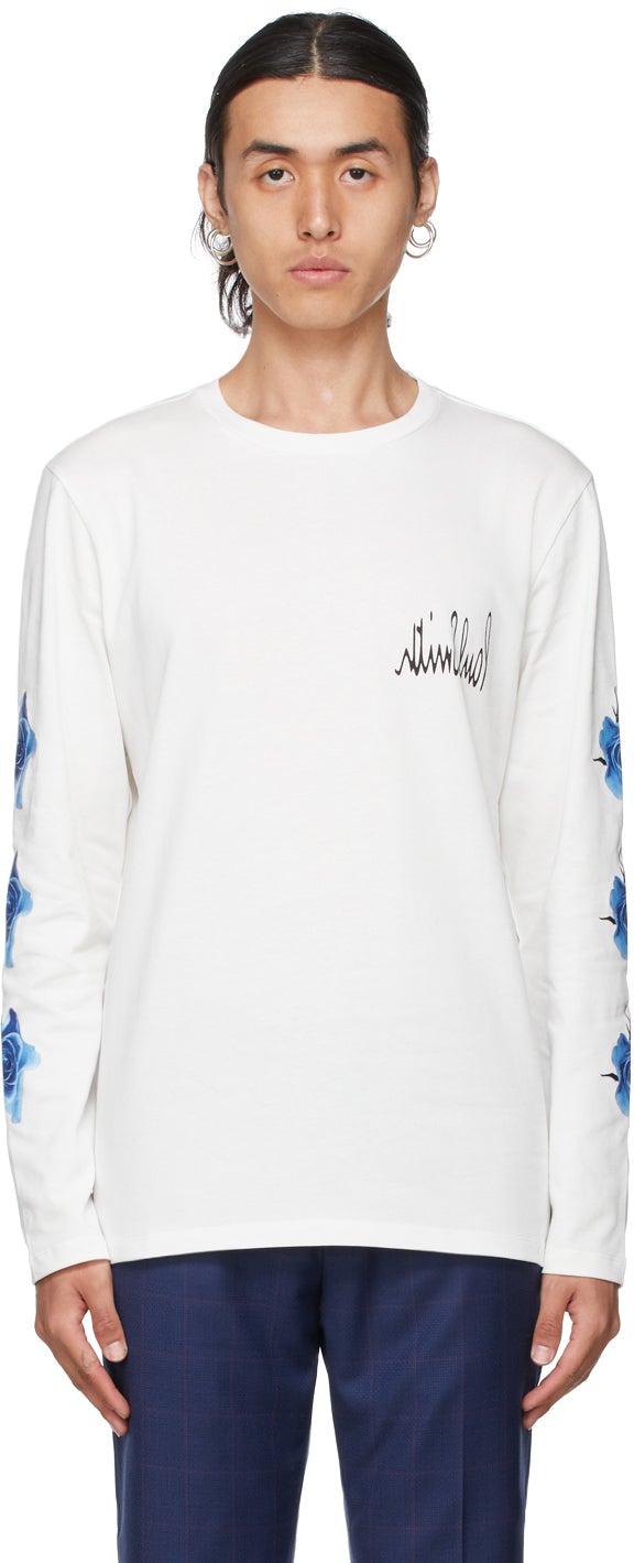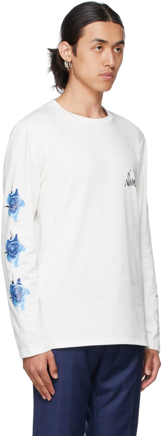 Long sleeve organic cotton jersey T-shirt in white. Rib knit crewneck collar. Logo printed in black at chest. Graphic pattern printed in tones of blue and black at sleeves. Vented side-seams. Tennis-tail hem. Supplier color: Blue 100% organic cotton. Brand: Paul Smith