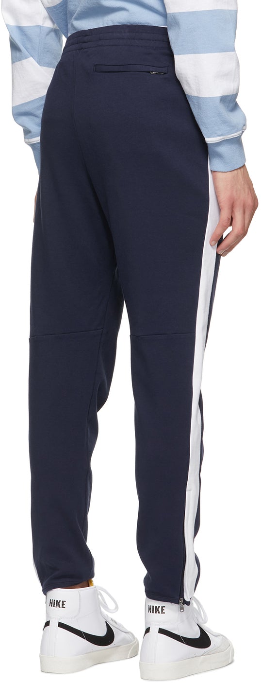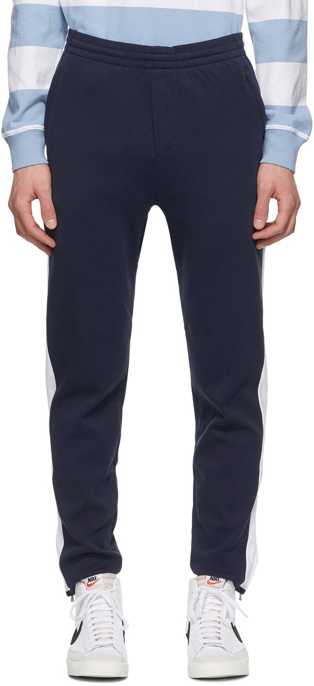 Slim-fit cotton jersey lounge pants in navy. Mid-rise. Three-pocket styling. Concealed drawstring at elasticized waistband. Logo embroidered in red at front. Stripe in white at outseams. Zippered vent at cuffs. Logo-engraved gunmetal-tone hardware. Supplier color: French navy 100% cotton. Brand: Polo Ralph Lauren