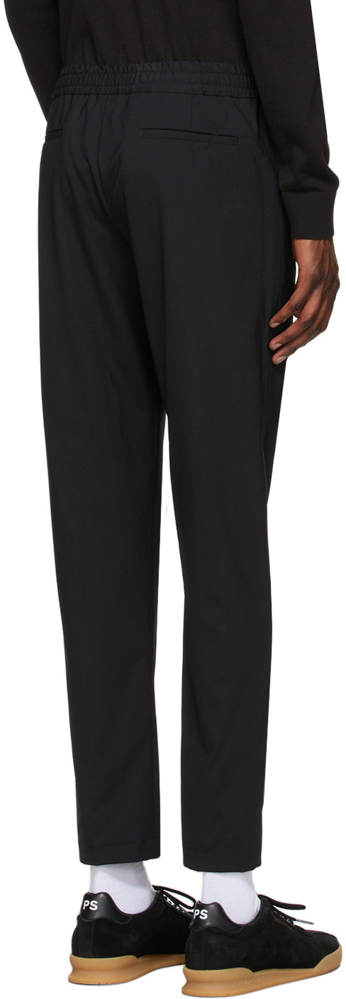 Tapered stretch woven wool trousers in black. Mid-rise. Four-pocket styling. Concealed drawstring at elasticized waistband. Central crease at front and back. Zip-fly. Logo-engraved silver-tone hardware. Supplier color: Black 97% wool, 3% elastane. Brand: PS by Paul Smith