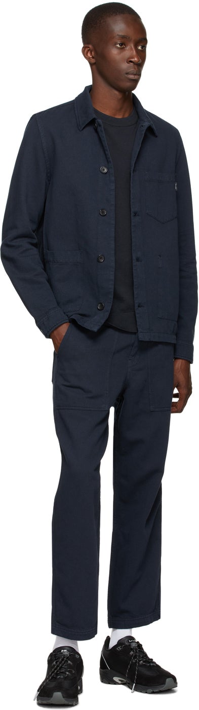 Wide-leg linen and cotton-blend twill trousers in navy. Four-pocket styling. Belt loops at waistband. Leather logo patch in brown at back waistband. Logo flag at back pocket. Zip-fly. Antiquated gold-tone and black hardware. Supplier color: Dark navy 60% linen, 40% cotton. Brand: PS by Paul Smith