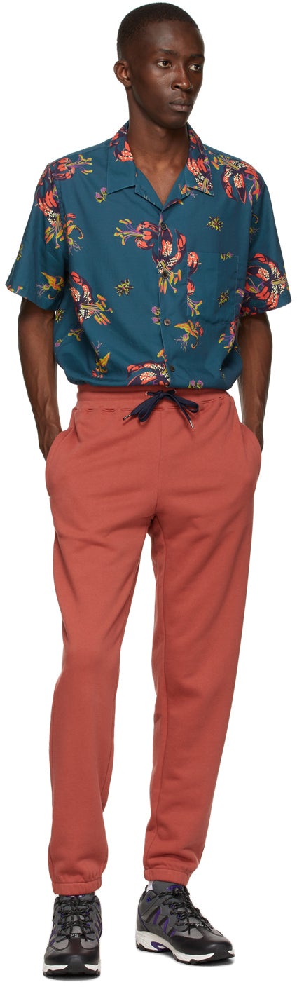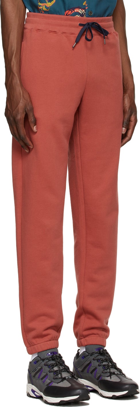 Relaxed-fit French terry lounge pants in red. Mid-rise. Three-pocket styling. Drawstring at elasticized waistband. Logo flocked in black at back pocket. Elasticized cuffs. Supplier color: Raspberry 100% cotton. Brand: PS by Paul Smith