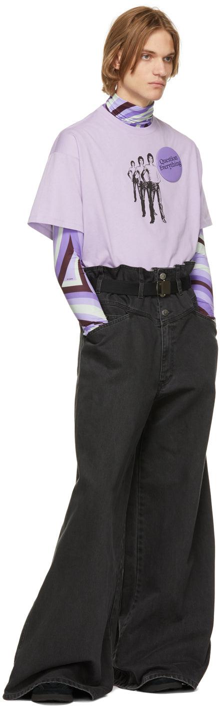 Short sleeve cotton jersey T-shirt in purple. Rib knit crewneck collar. Graphic printed in black at front. Detachable metal pin with hinged post fastening at front. Supplier color: Lilac 100% cotton. Brand: Raf Simons