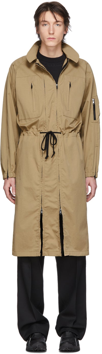 Long sleeve cotton gabardine coat in beige. Spread collar. Twin two-way zip closures at front. Zippered pockets at chest and waist. Drawstring at waist. Zippered pocket at upper sleeve. Zippered vent at elasticized cuffs. Unlined. Gunmetal-tone hardware. Supplier color: Beige 100% cotton. Brand: Random Identities