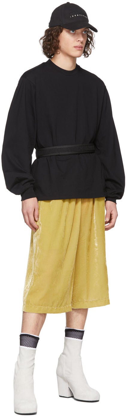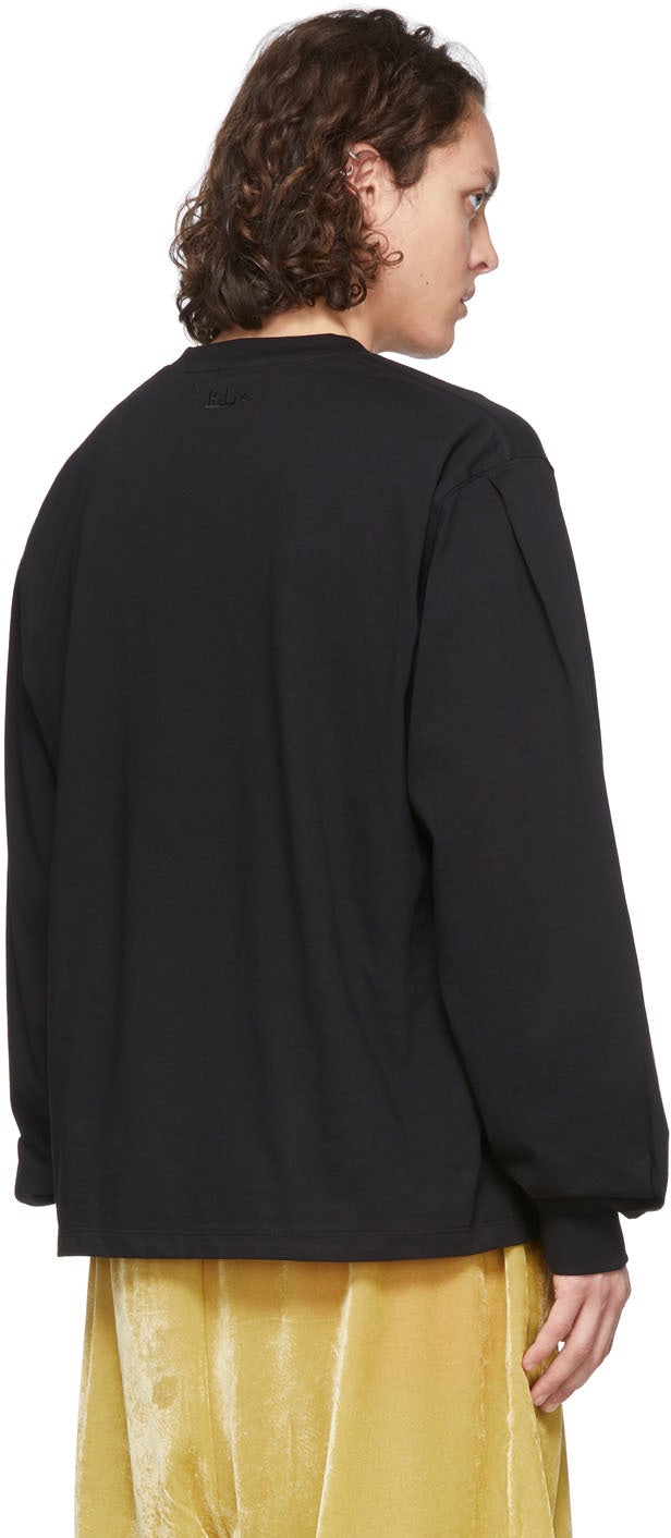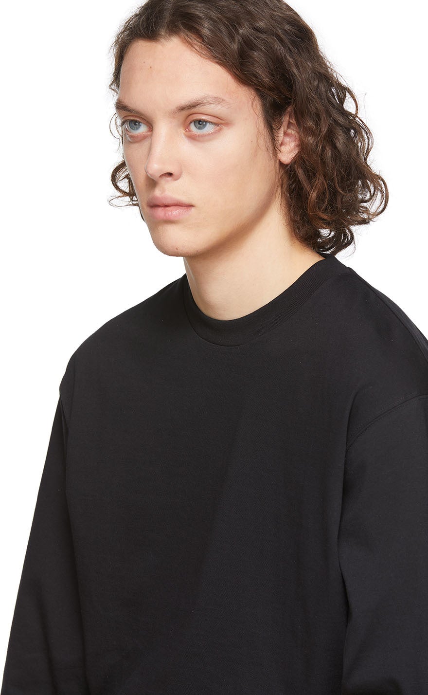 Long sleeve cotton jersey t-shirt in black. Rib knit crewneck collar and cuffs. Pleats at shoulder and cuffs. Tonal embroidered logo at back collar. Dropped shoulders. Supplier color: Black 100% cotton. Brand: Random Identities
