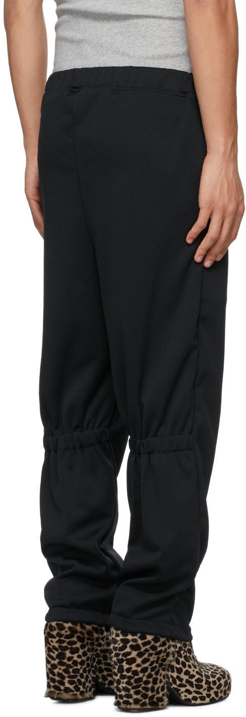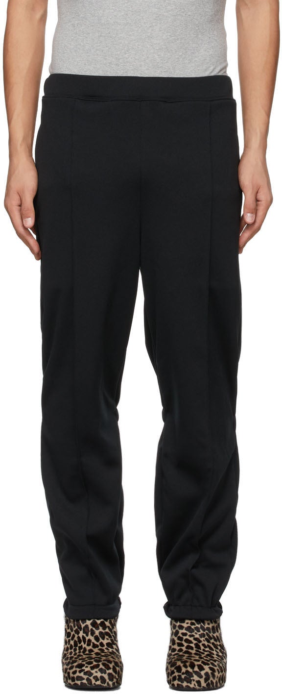 Tapered jersey lounge pants in black. Mid-rise. Two-pocket styling. Concealed drawstring at elasticized waistband. Pinched seam at front. Elasticized trim at back knees. Elasticized cuffs. Unlined. Silver-tone hardware. Supplier color: Black 100% polyester. Brand: Random Identities