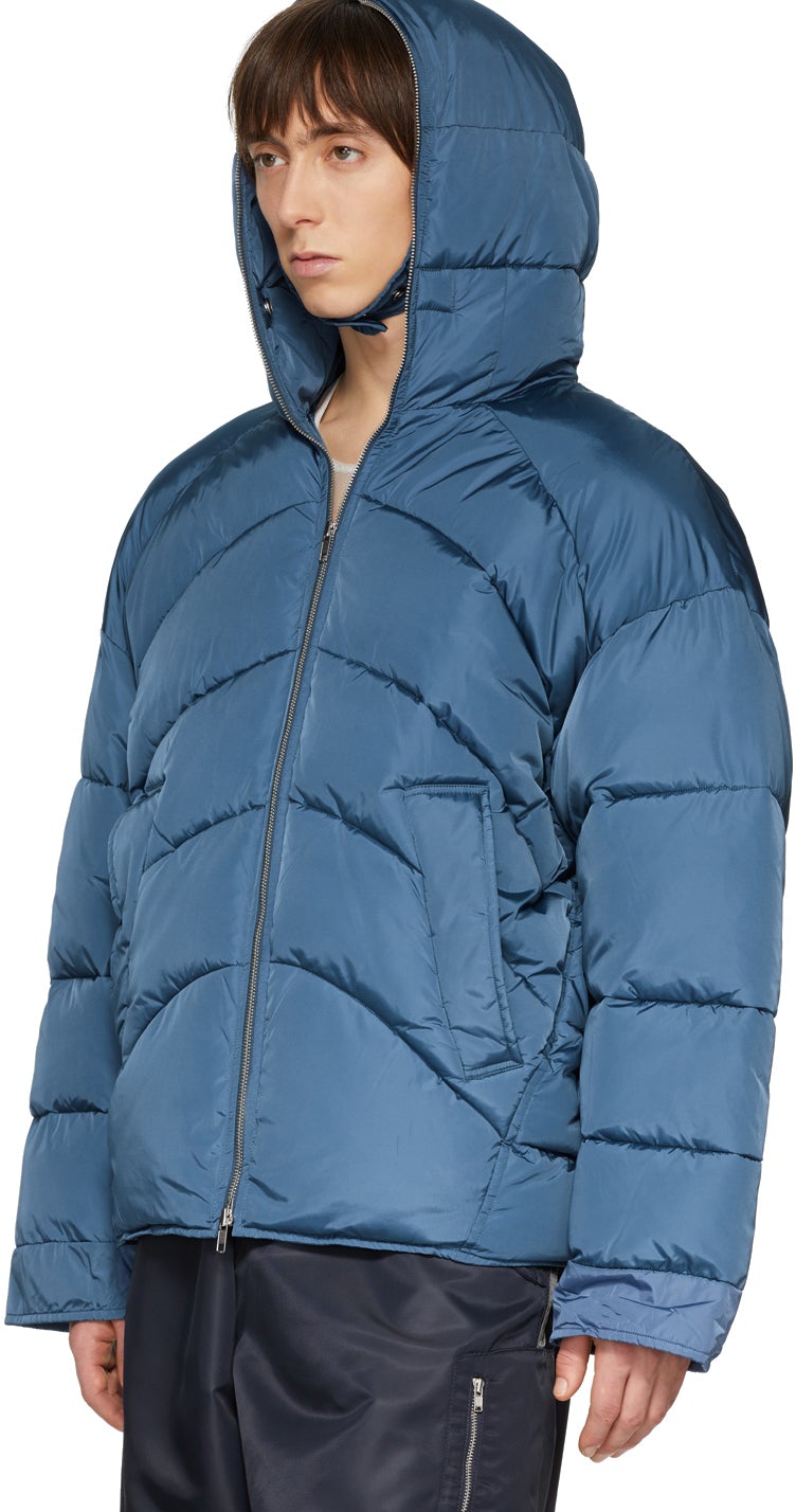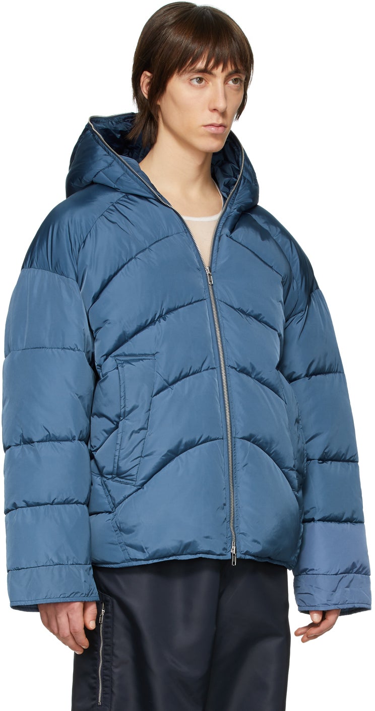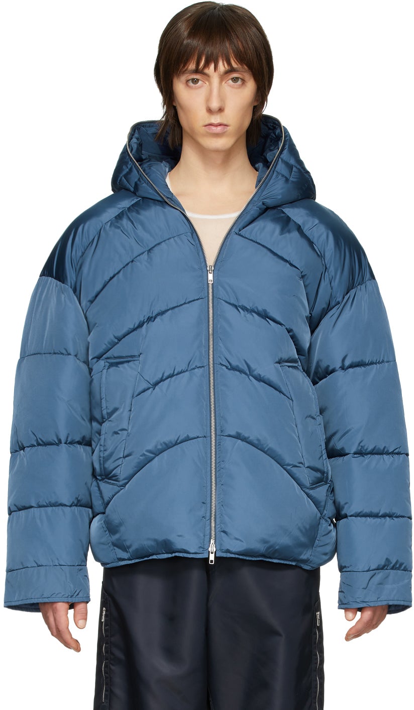 Long sleeve insulated quilted nylon jacket in blue. Elasticized strap with press-stud fastening at hood interior. Two-way zip closure at front extends to hood. Welt pockets at waist. Concealed bungee-style drawstring at hem. Fully lined. Silver-tone hardware. Supplier color: Avio Body: 100% polyamide. Fill: 100% polyester. Brand: Random Identities