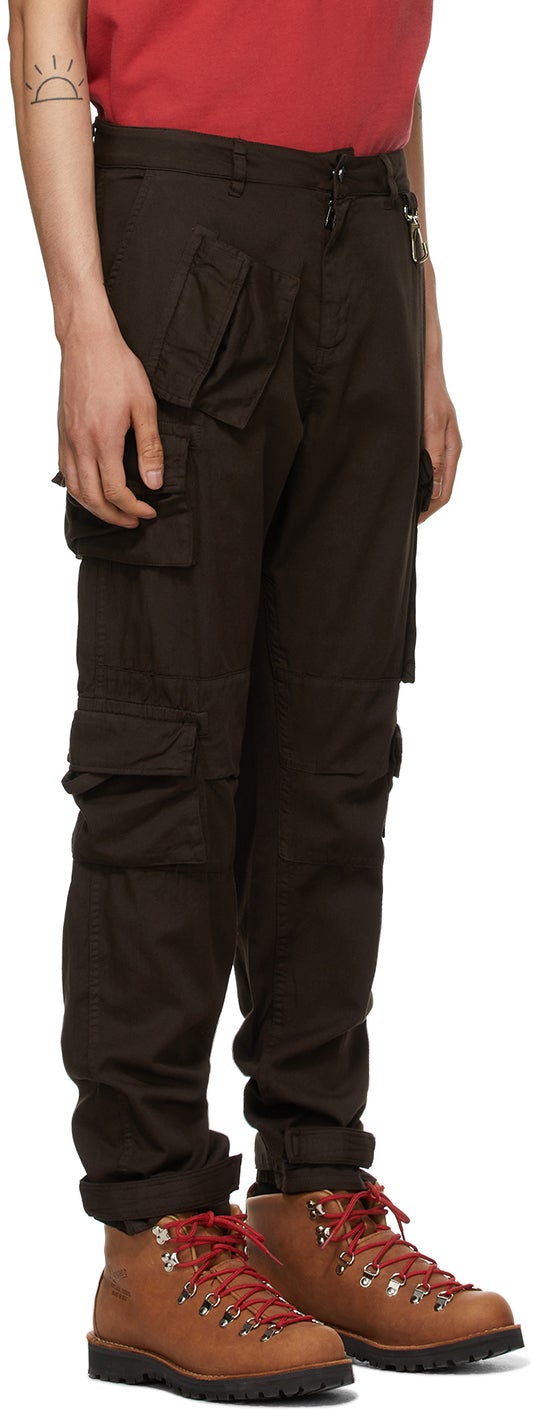 Tapered cotton twill cargo pants in brown. Low-rise. Five-pocket styling. Belt loops and lanyard clasp hardware at waistband. Flap pockets at outseams. Adjustable Velcro tab at cuffs. Zip-fly. Antiqued gold-tone and silver-tone hardware. Supplier color: Brown 100% cotton. Brand: Reese Cooper