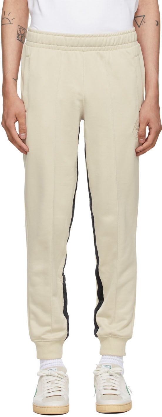 Relaxed-fit French terry lounge pants in beige. Mid-rise. Four-pocket styling. Concealed drawstring at elasticized waistband. Pinched seams at legs. Tonal logo embroidered at front. Velvet trim in black at inseams. Rib knit cuffs. Silver-tone hardware. Part of the Puma x Rhuigi collaboration. Supplier color: Oatmeal 59% polyester, 41% cotton. Brand: Rhude