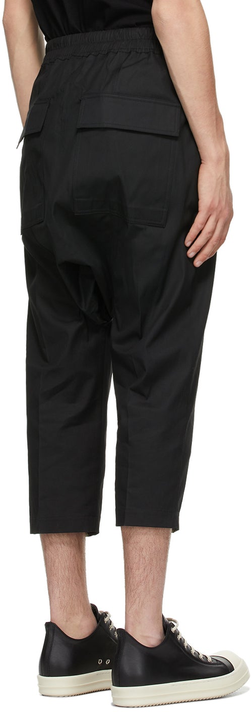 Relaxed-fit stretch cotton poplin trousers in black. Mid-rise. Dropped inseam. Cropped leg. Four-pocket styling. Grey drawstring at waistband. Button-fly. Horn hardware. Supplier color: Black 97% cotton, 3% elastane. Brand: Rick Owens