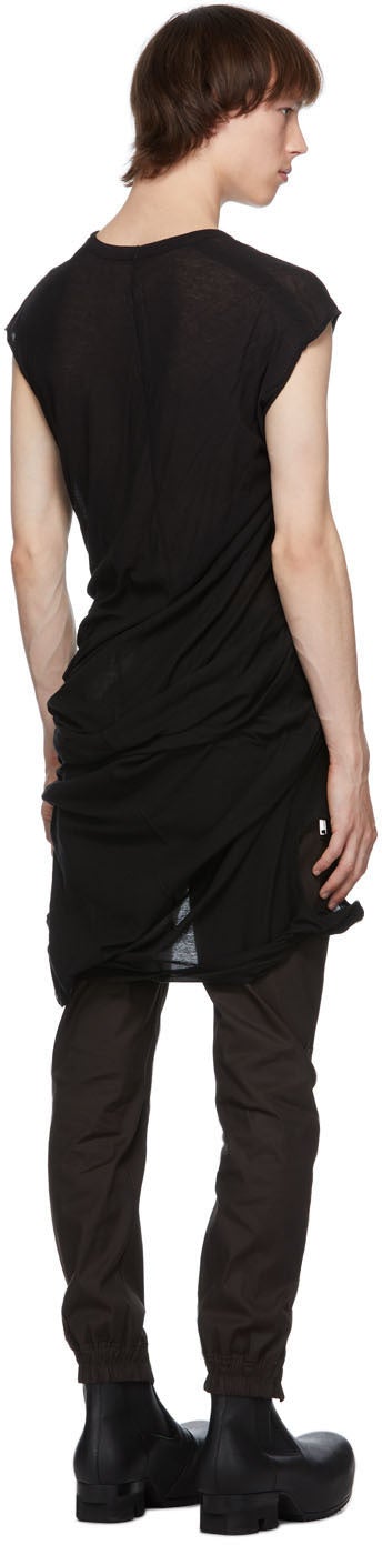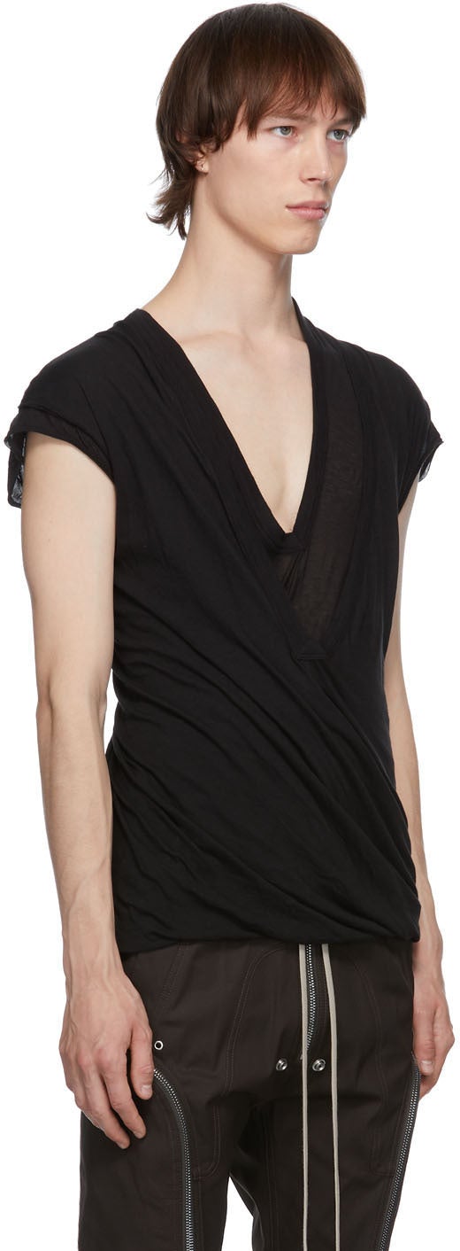 Cap sleeve cotton jersey T-shirt in black. Layered construction. Rib knit V-neck collar. Raw edge at cuffs. Central pinched seam at back. Supplier color: Black 100% cotton. Brand: Rick Owens