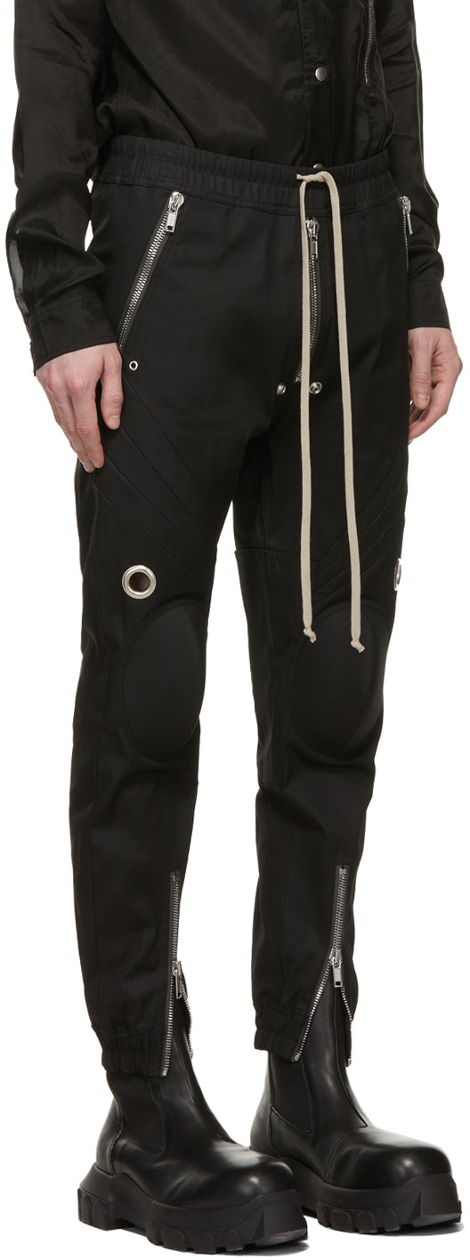 Slim-fit paneled stretch cotton poplin trousers in black. Mid-rise. Eyelet detailing throughout. Four-pocket styling. Drawstring in grey at waistband. Padding at knees. Zippered vents at elasticized cuffs. Zip-fly. Tonal cupro satin lining. Fully lined. Silver-tone hardware. Supplier color: Black Body: 97% cotton, 3% elastane. Lining: 100% cupro. Brand: Rick Owens