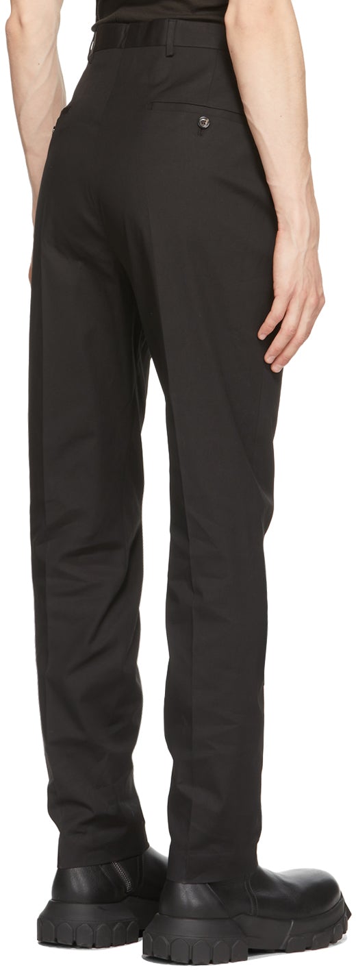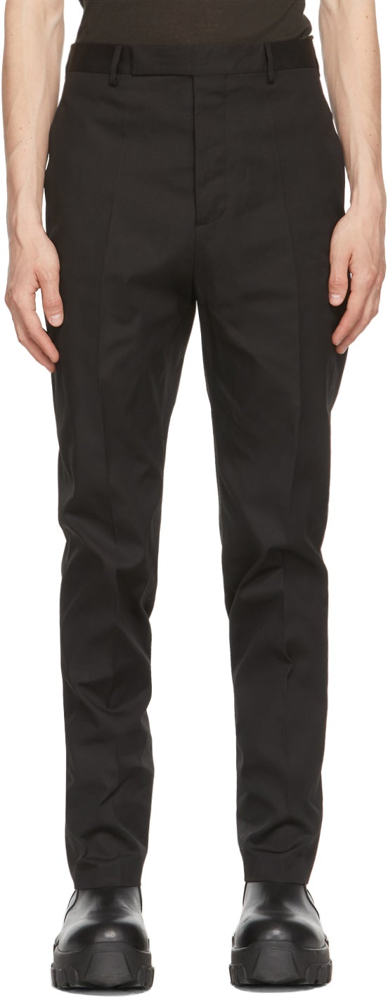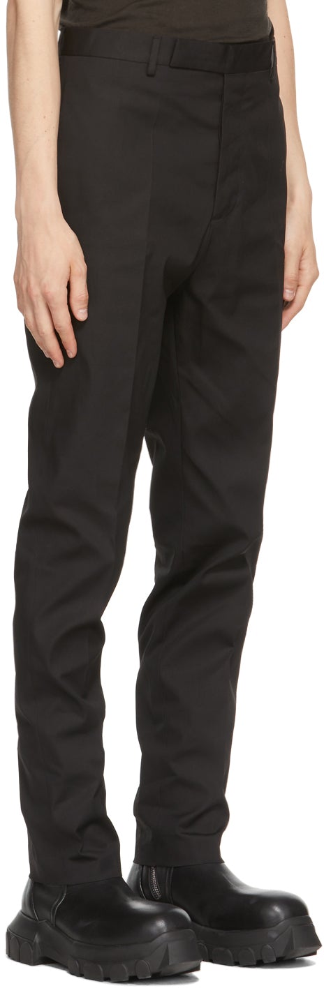 Slim-fit wool and mohair-blend canvas trousers in black. Mid-rise. Dropped inseam. Four-pocket styling. Belt loops at waistband. Central creases at front legs. Unlined. Zip-fly. Supplier color: Black 62% wool, 38% mohair. Brand: Rick Owens