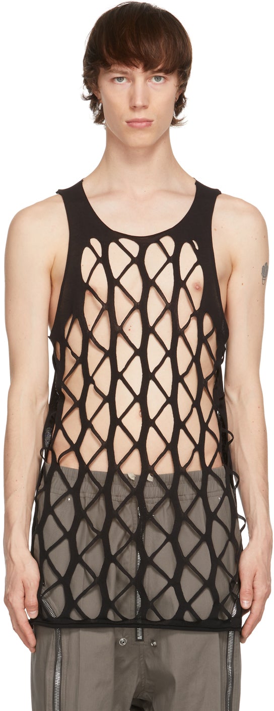 Sleeveless open knit cotton tank top in black. Crewneck collar. Supplier color: Black 100% cotton. Brand: Rick Owens