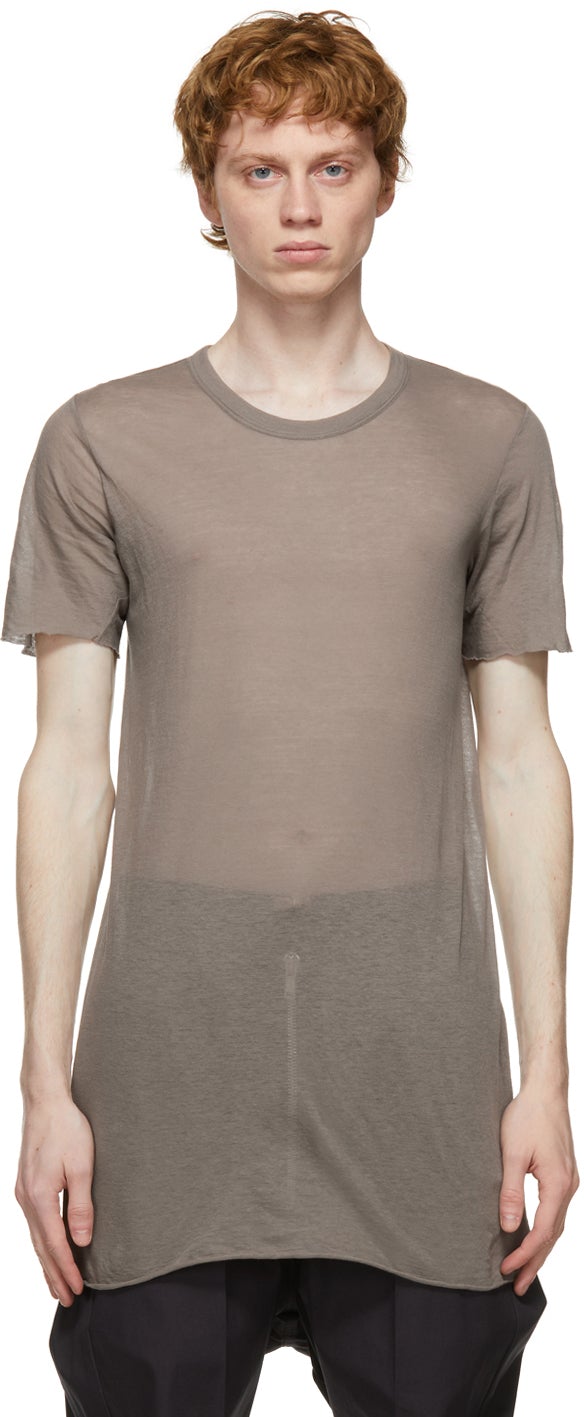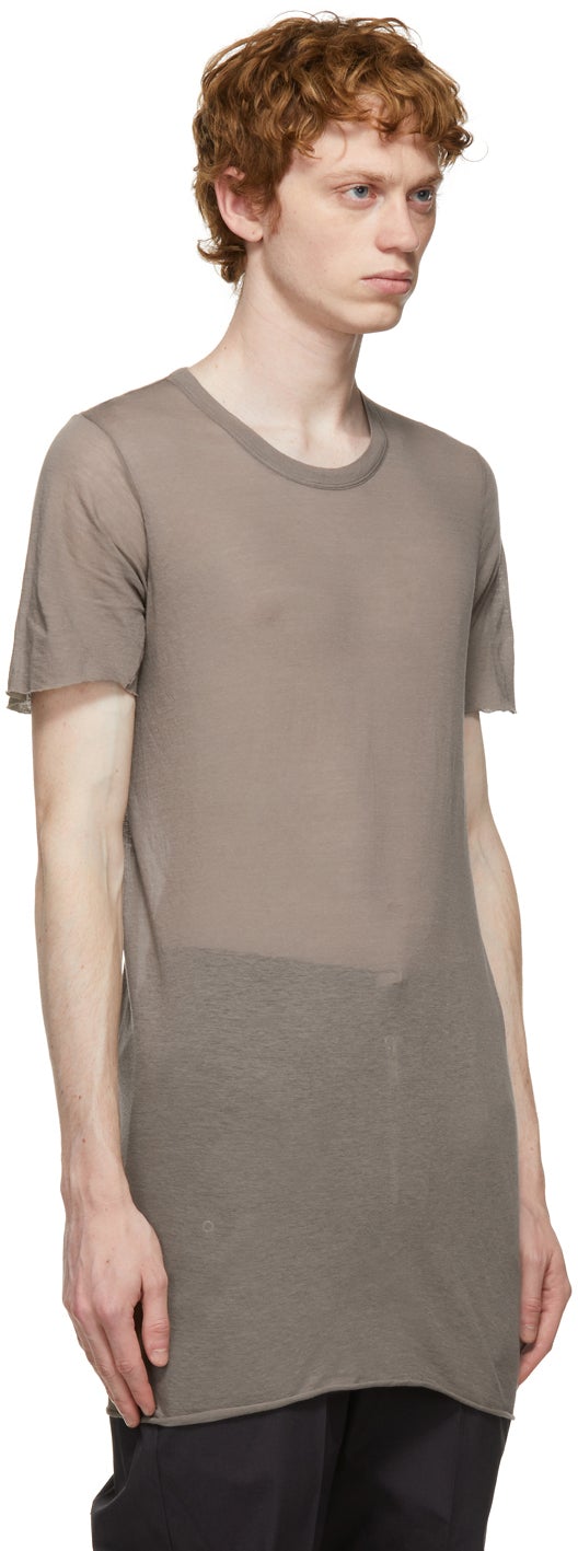 Short sleeve semi-sheer organic cotton jersey T-shirt in grey. Rib knit crewneck collar. Raw edge at cuffs and hem. Offset seam at back. Supplier color: Dust 100% organic cotton. Brand: Rick Owens