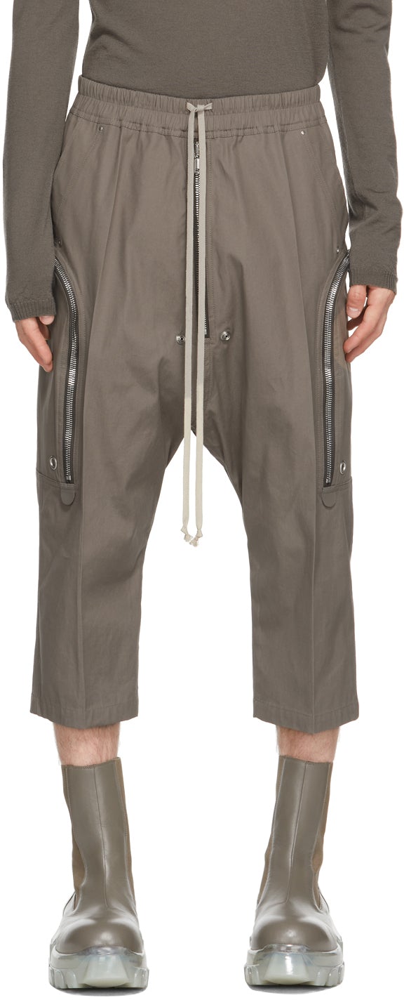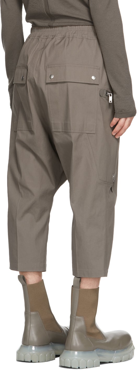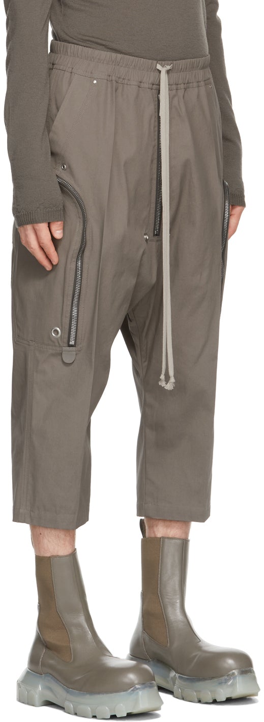 Tapered Italian stretch organic cotton canvas cargo pants in grey. Mid-rise. Dropped inseam. Cropped leg. Four-pocket styling. Drawstring at elasticized waistband. Press-stud, rivet, and eyelet detailing at front. Zippered pocket with black calfskin trim at outseams. Zip-fly. Silver-tone hardware. Supplier color: Dust Body: 97% organic cotton, 3% elastane. Trim: 100% calfskin. Brand: Rick Owens