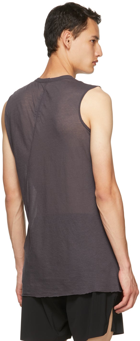Sleeveless cotton jersey tank top in purple. Scoop rib knit neck collar. Frayed detailing at armscyes. Unfinished hem. Supplier color: Plum 100% cotton. Brand: Rick Owens