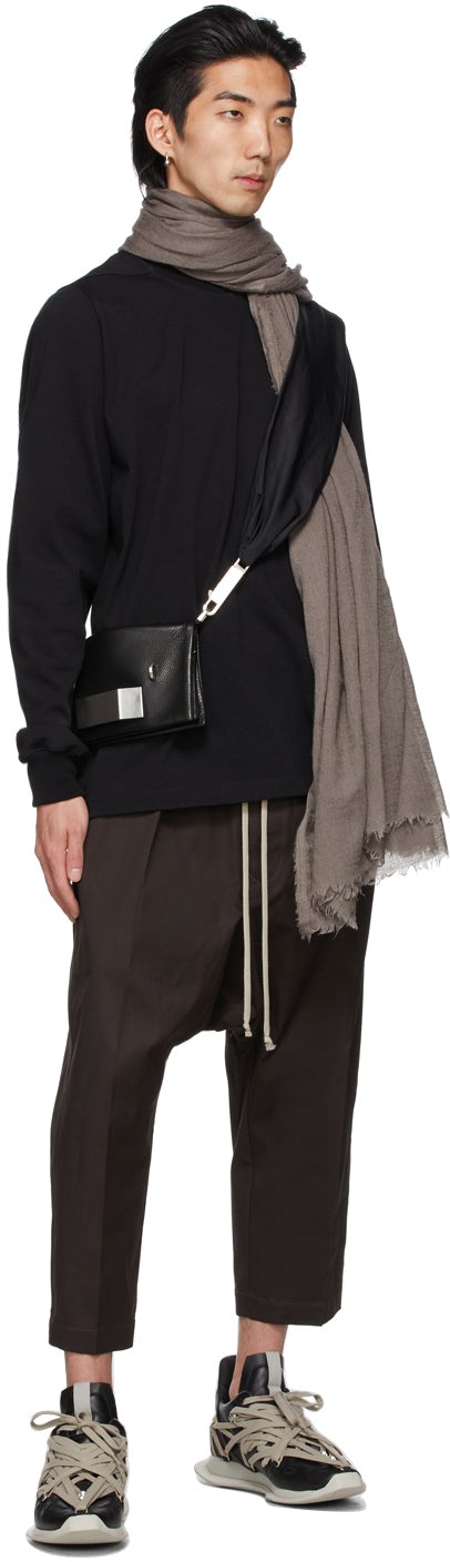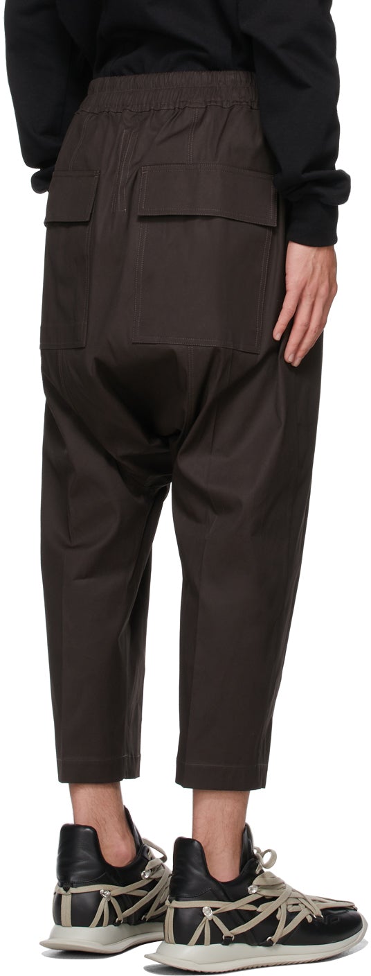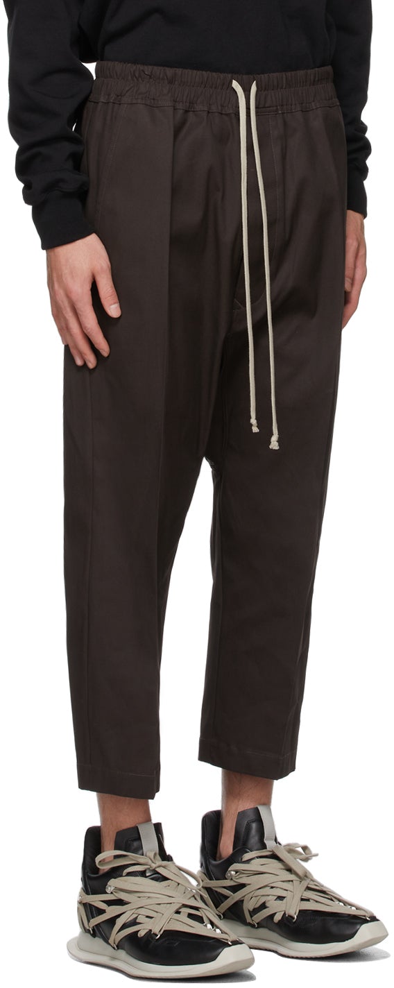 Tapered stretch woven cotton canvas trousers in dark grey. Mid-rise. Four-pocket styling. Drawstring at elasticized waistband. Dropped inseam. Cropped legs. Button-fly. Available exclusively at SSENSE. Supplier color: Darkdust 97% cotton, 3% elastane. Brand: Rick Owens