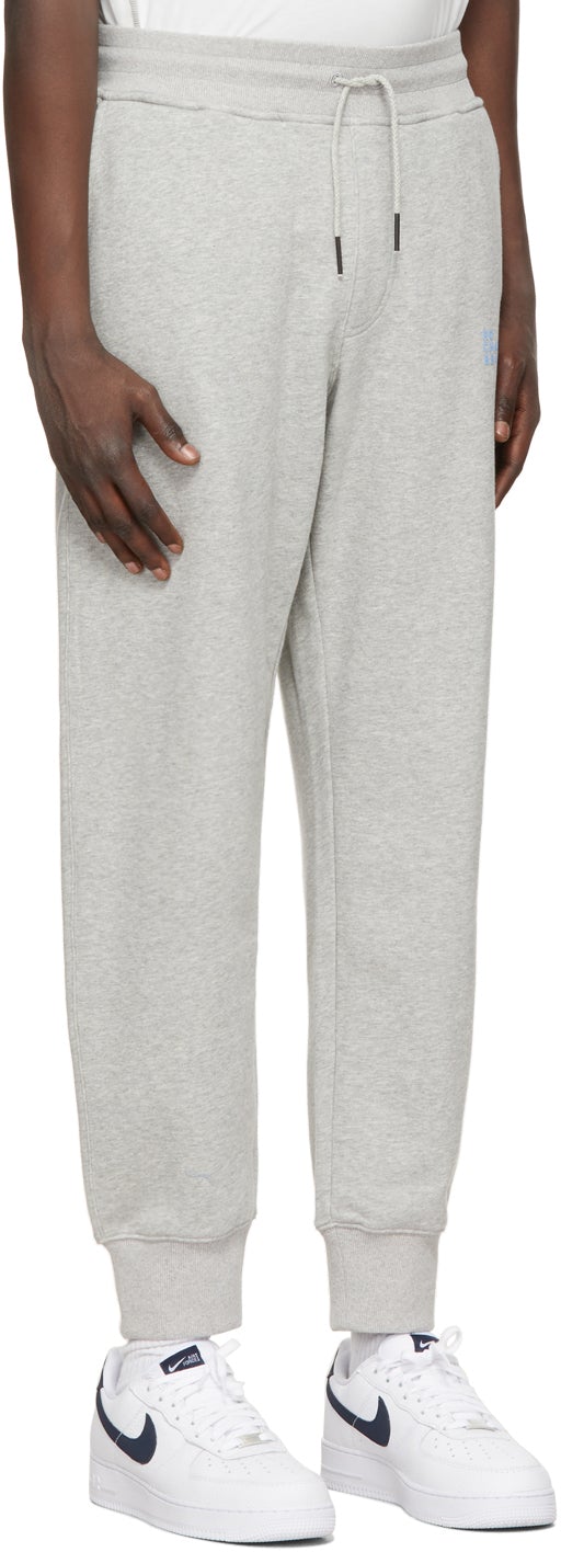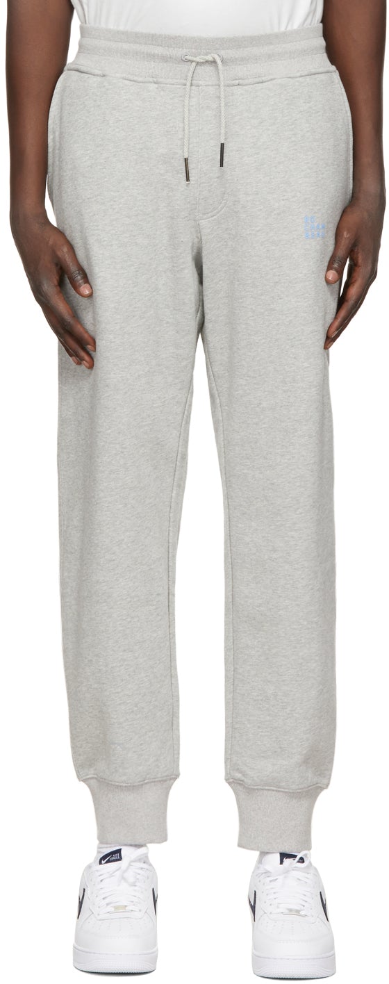 Tapered French terry lounge pants in heather grey. Mid-rise. Three-pocket styling. Drawstring at elasticized waistband. Bonded logo in blue at front leg. Elasticized cuffs. Mock-fly. Supplier color: Heather grey 100% cotton. Brand: Rochambeau