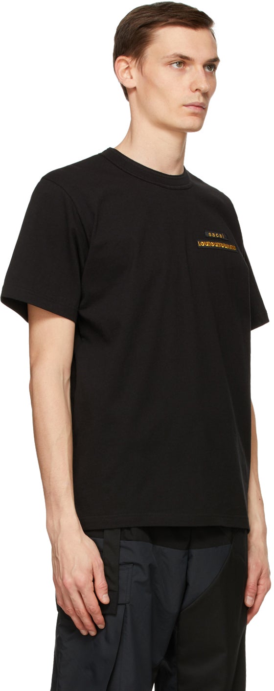 Short sleeve cotton jersey T-shirt in black. Rib knit crewneck collar. Embroidered logo and graphic patches in yellow at chest. Text printed in white at back. Part of the Sacai x Hank Willis Thomas collaboration. Supplier color: Black 100% cotton. Brand: Sacai