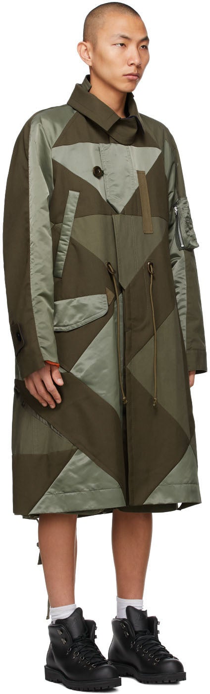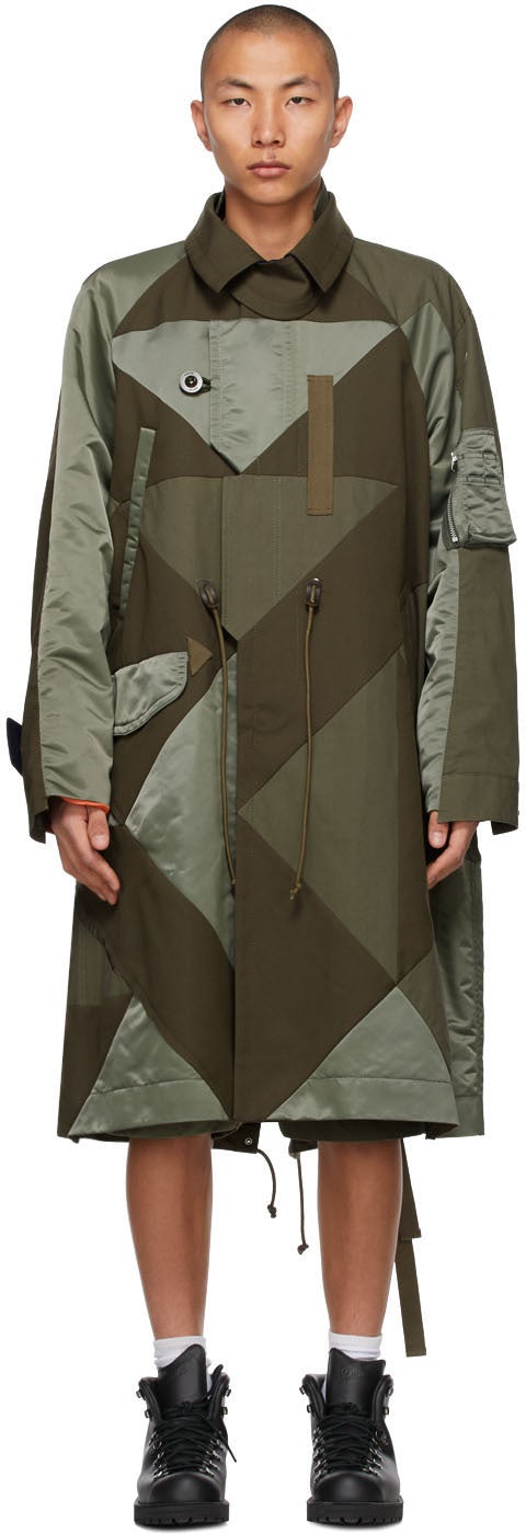 Long sleeve quilted paneled cotton twill and nylon twill coat colorblocked in khaki and brown. Throat guard at spread collar featuring inset stand collar. Concealed button closure at front. Welt pocket and webbing trim at chest. Drawstring featuring buffed leather trim in brown at waist. Welt pocket and flap pocket at waist. Zippered utility pocket at sleeve. Button accent at wool-blend inset cuffs. Button accent and wool-blend felted trim at back collar. Central vent, press-stud closure, and drawstring at back hem. Full cupro satin lining in green featuring logo printed in black. Brown and silver-tone hardware. Part of the Sacai x Hank Willis Thomas collaboration. Supplier color: Khaki Body: 70% cotton, 30% nylon. Trim 1: 80% wool, 20% polyester. Trim 2: 100% leather. Fill: 100% polyester. Lining: 100% cupro. Brand: Sacai