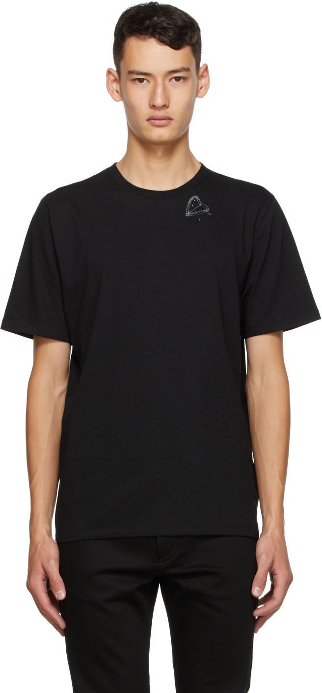 Short sleeve cotton jersey T-shirt in black. Rib knit crewneck collar. Graphic printed in grey at chest. Raw edge at back hem. Supplier color: Black/Grey 100% cotton. Brand: Saint Laurent