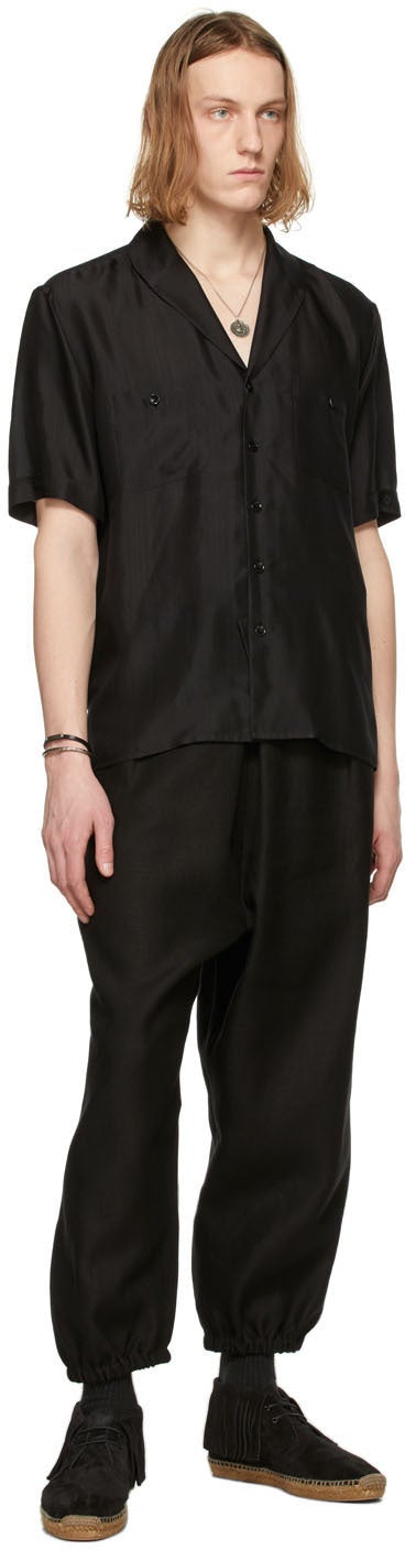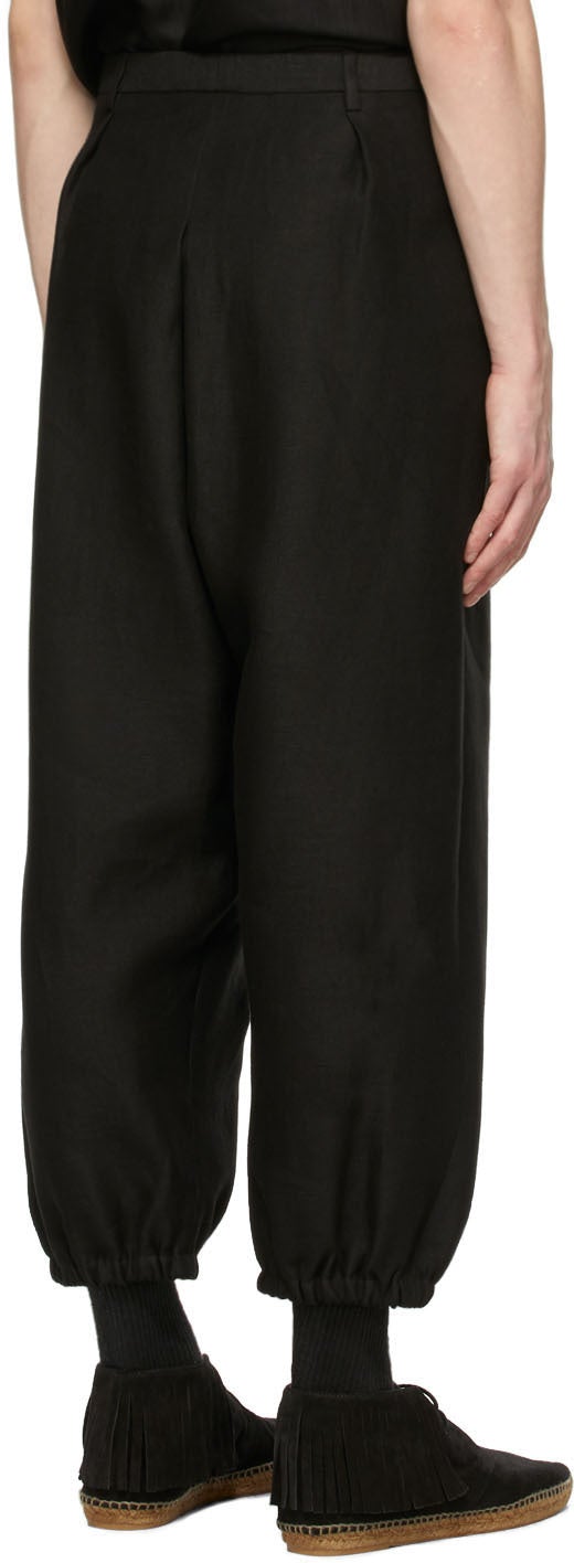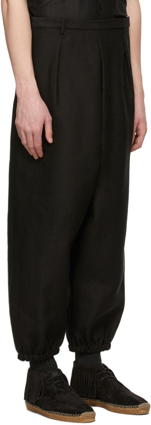 Tapered linen and cotton-blend trousers in black. Mid-rise. Two-pocket styling. Belt loops at waistband. Pleats at front and back. Elasticized cuffs. Zip-fly. Supplier color: Black Body: 72% linen, 28% cotton. Trim: 100% silk. Brand: Saint Laurent