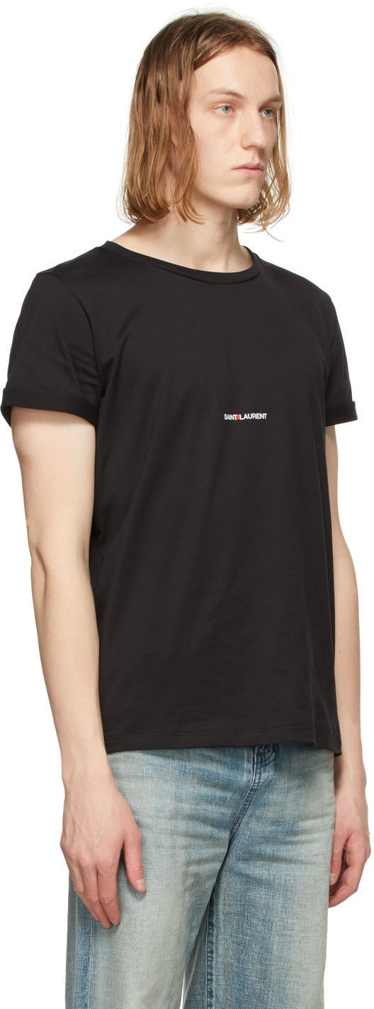 Short sleeve cotton jersey T-shirt in black. Rib knit crewneck collar. Logo printed in white and red at front. Rolled cuffs. Raw edge at back hem. Supplier color: Black 100% cotton. Brand: Saint Laurent