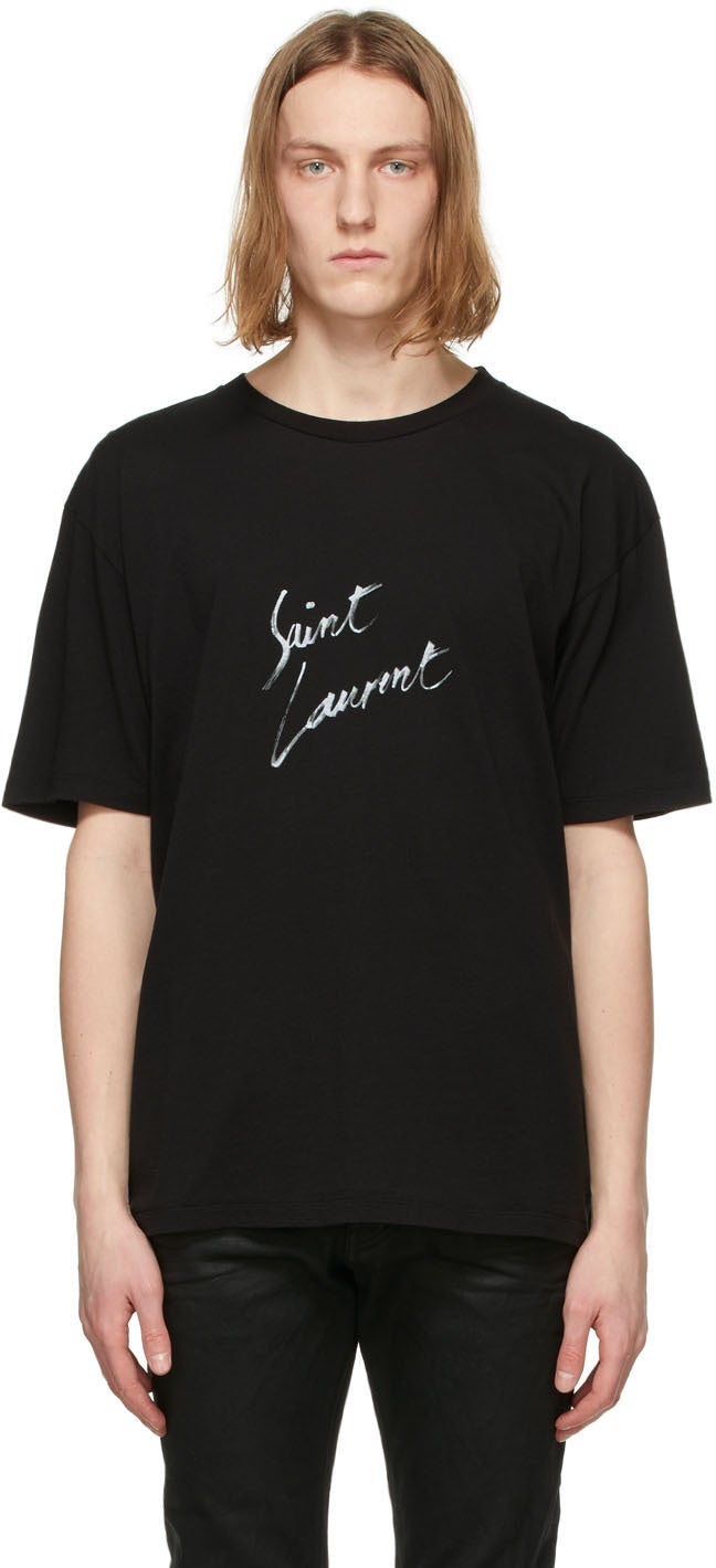 Short sleeve cotton jersey T-shirt in black. Rib knit crewneck collar. Logo printed in tones of grey at front. Raw edge at back hem. Supplier color: Black 100% cotton. Brand: Saint Laurent