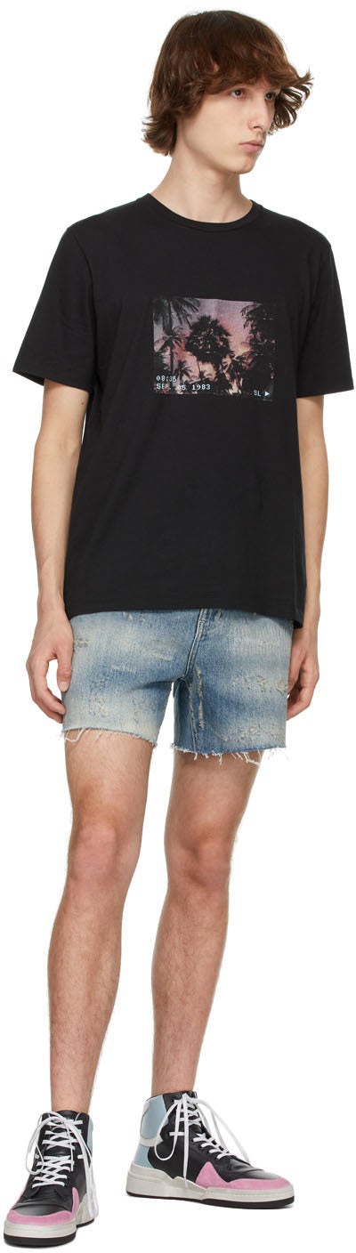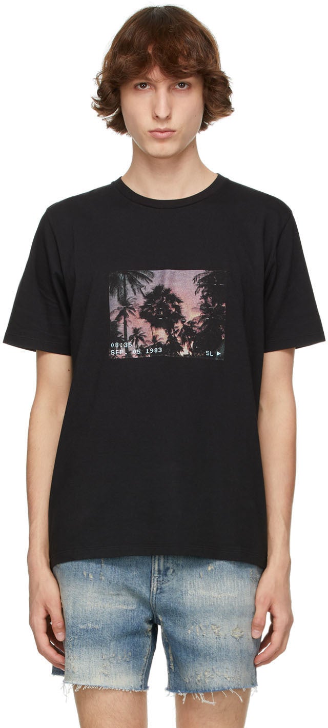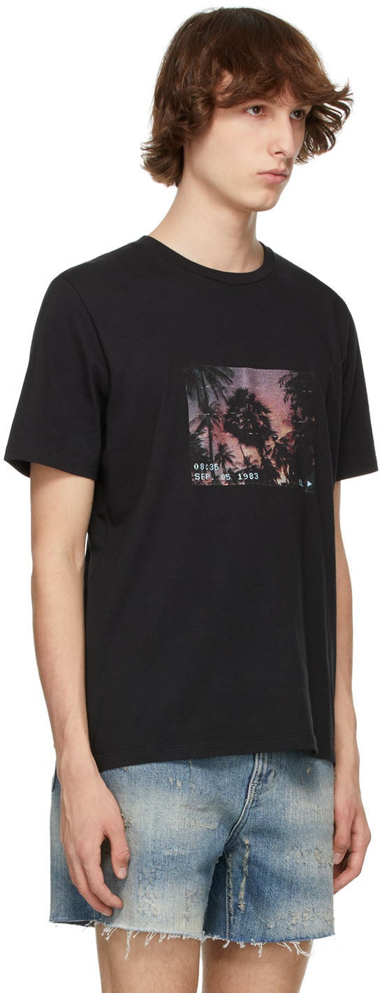 Short sleeve cotton jersey T-shirt in black. Rib knit crewneck collar. Graphic printed in multicolor at chest. Supplier color: Black/Multicolor 100% cotton. Brand: Saint Laurent