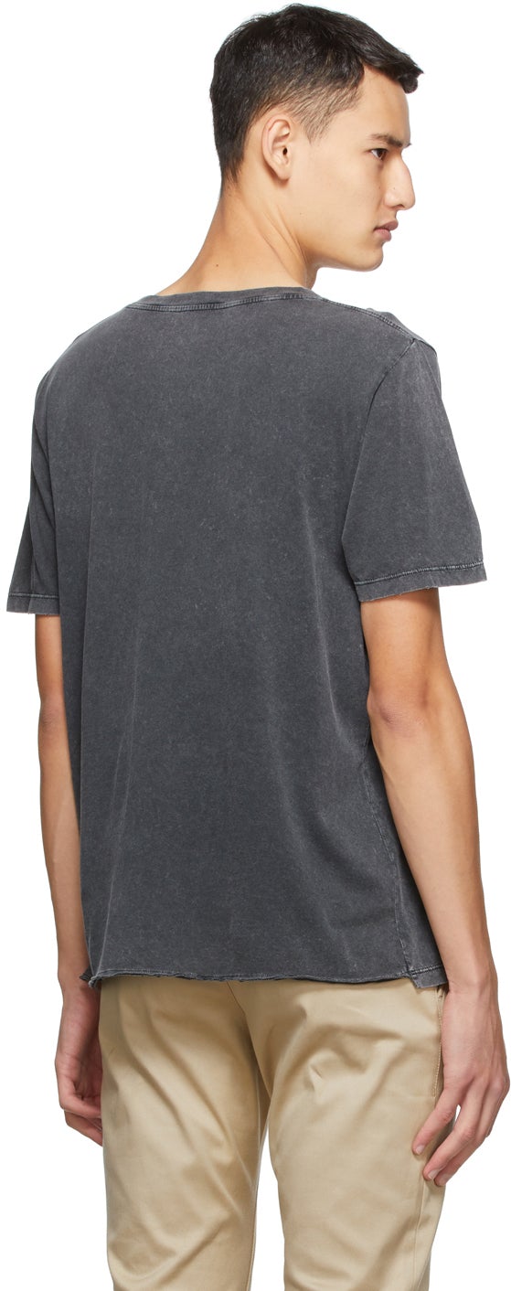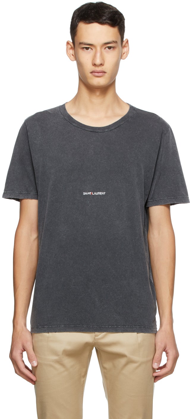 Short sleeve cotton jersey T-shirt in grey. Fading throughout. Rib knit crewneck collar. Printed logo in red and white at chest. Distressing at hem. Supplier color: Washed black 100% cotton. Brand: Saint Laurent