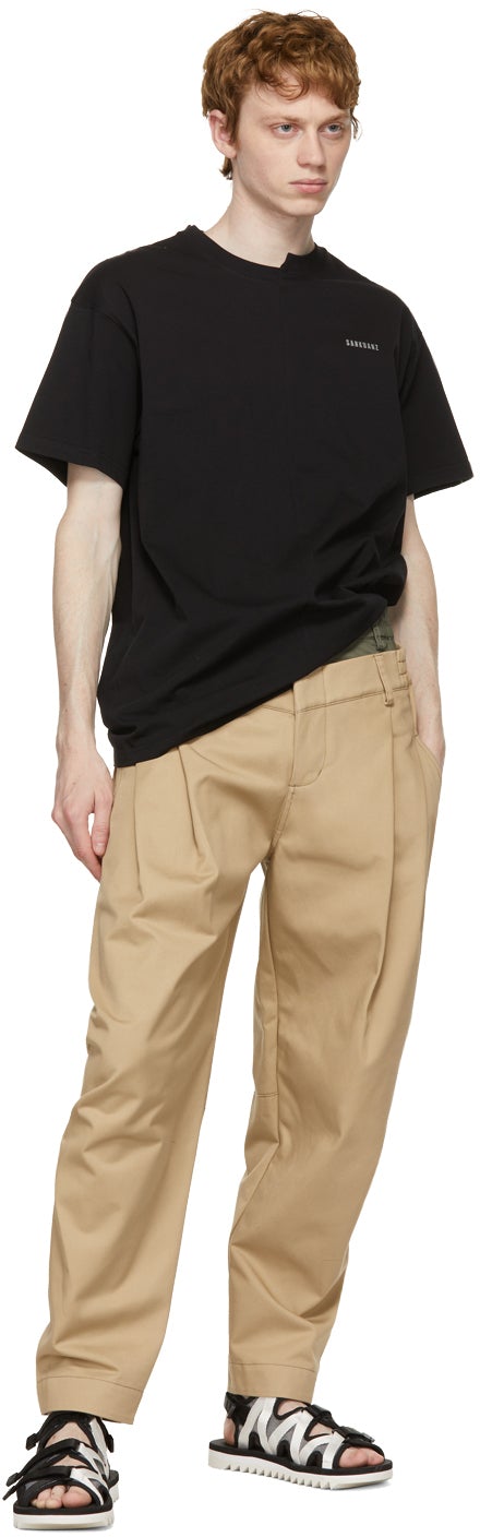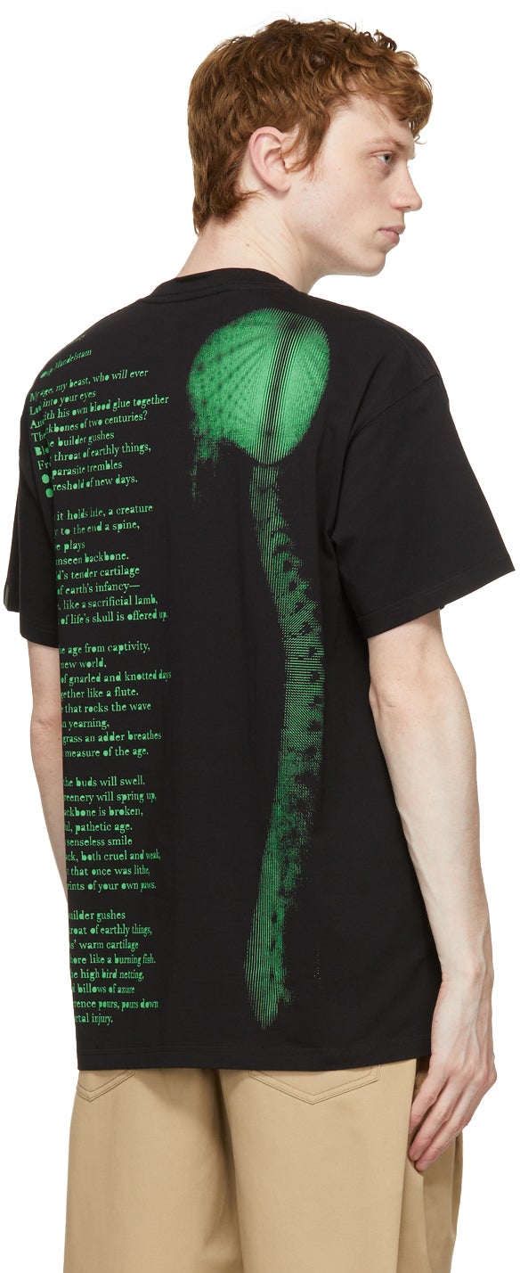 Short sleeve cotton jersey T-shirt in black. Asymmetric paneled construction. Rib knit crewneck collar. Logo printed in reflective silver-tone at chest. Graphic and text printed in green at back. Supplier color: Black 100% cotton. Brand: Sankuanz