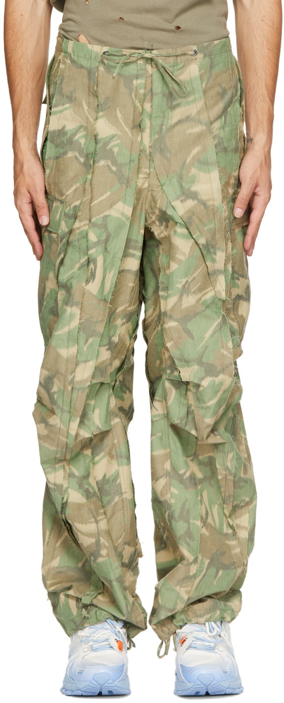 Straight-leg paneled cotton-blend canvas cargo pants featuring camouflage pattern in tones of green, khaki, and beige. Mid-rise. Distressing throughout. Three-pocket styling. Drawstring at waistband. Flap pockets at outseams. Drawstring at cuffs. Zip-fly. Silver-tone hardware. Supplier color: Camo green 56% cotton, 44% polyester. Brand: Sankuanz