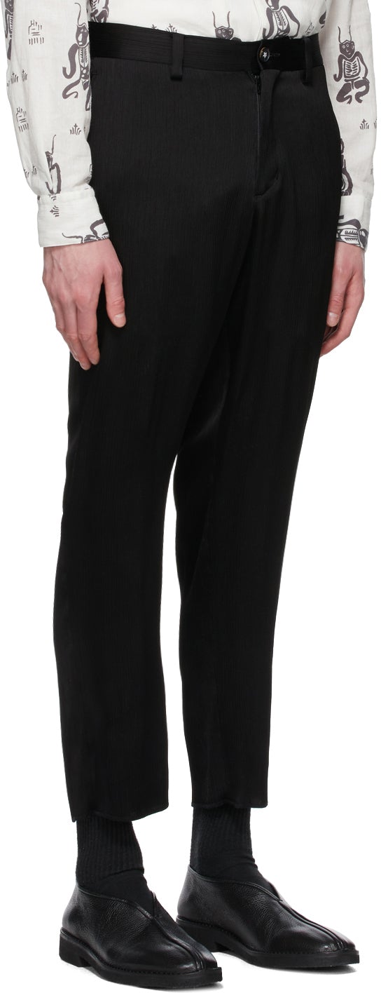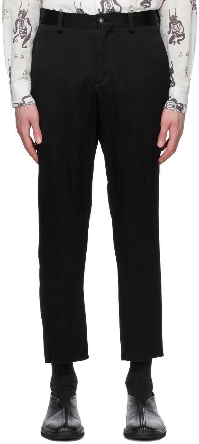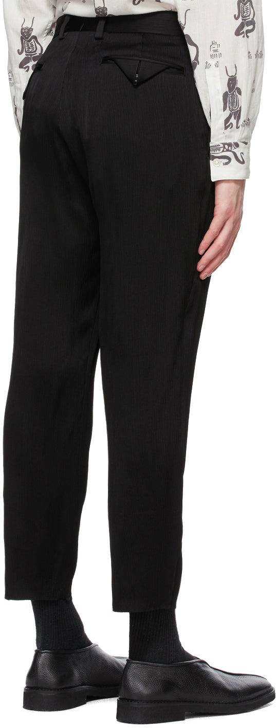 Slim-fit garment-pleated crêpe de chine trousers in black. Mid-rise. Four-pocket styling. Belt loops at waistband. Unfinished hem. Zip-fly. Tonal hardware. Supplier color: Black Body: 68% triacetate, 18% rayon, 14% cupro. Trim: 100% cupro. Brand: Sasquatchfabrix.