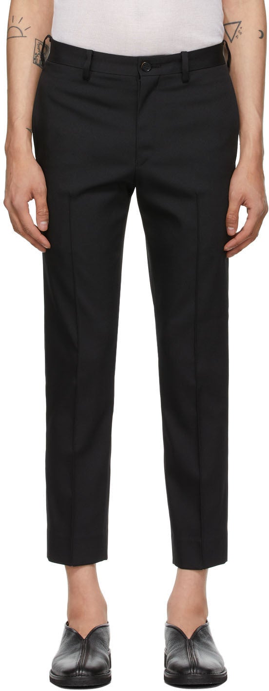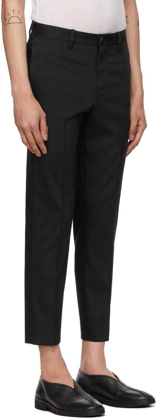 Slim-fit twill trousers in black. Mid-rise. Four-pocket styling. Belt loops at waistband. Central crease at front. Zip-fly. Tonal hardware. Supplier color: Black Body: 82% polyester, 16% rayon, 2% polyurethane. Trim: 100% cupro. Brand: Sasquatchfabrix.