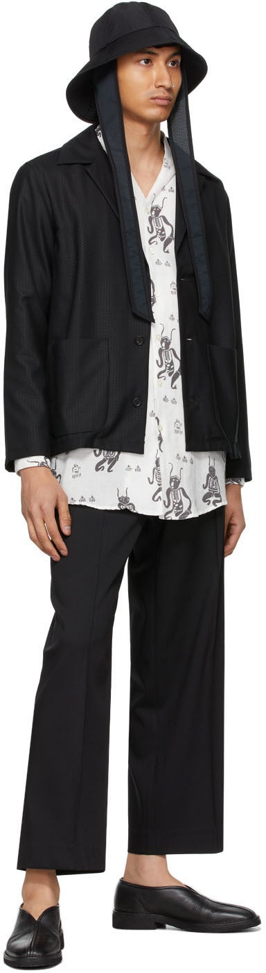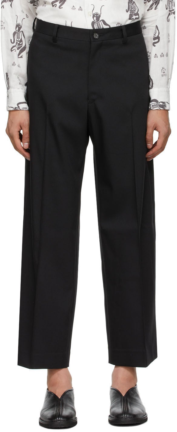 Wide-leg twill trousers in black. Mid-rise. Four-pocket styling. Belt loops at waistband. Central crease at front. Zip-fly. Tonal hardware. Supplier color: Black Body: 82% polyester, 16% rayon, 2% polyurethane. Trim: 100% cupro. Brand: Sasquatchfabrix.