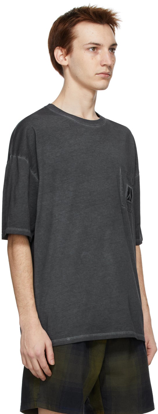 Short sleeve garment-dyed cotton jersey T-shirt in grey. Fading throughout. Rib knit crewneck collar. Patch pocket, tonal embroidered graphic patch, and textile logo flag at chest. Dropped shoulders. Each item is unique. Please note coloration may vary. Supplier color: Viridian 100% cotton. Brand: Saturdays NYC