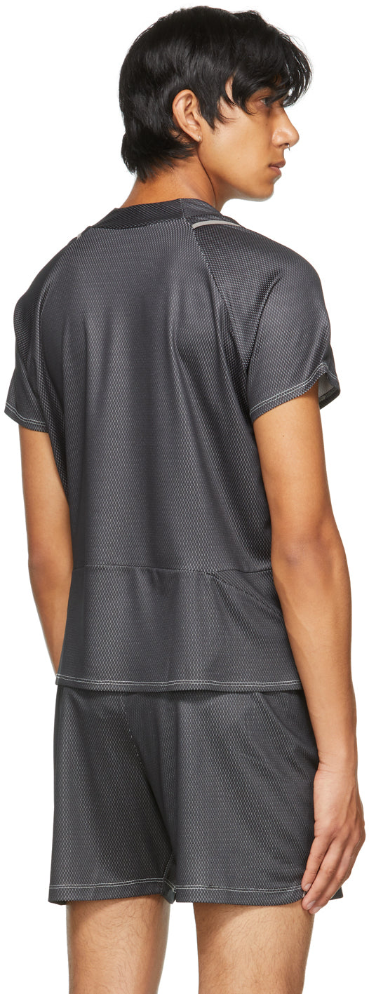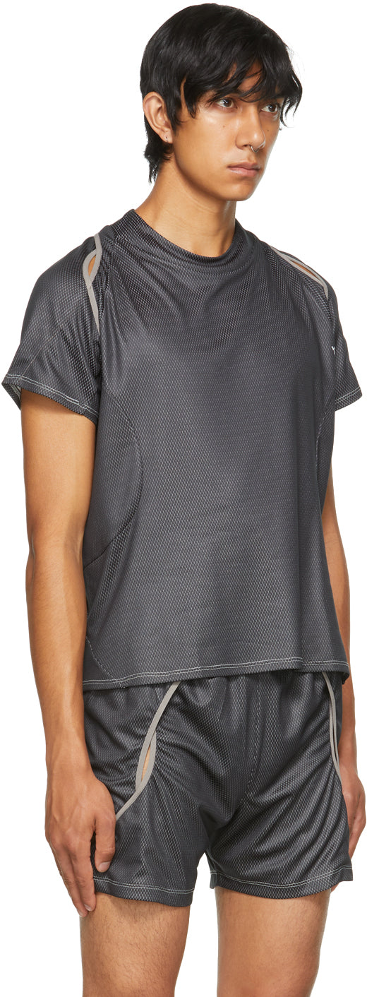 Short sleeve mesh T-shirt in black and grey. Paneled construction. Trim in grey throughout. Crewneck collar. Cut-outs at shoulders. Logo printed in reflective silver-tone at shoulder. Supplier color: Black/Grey 100% polyester. Brand: Saul Nash