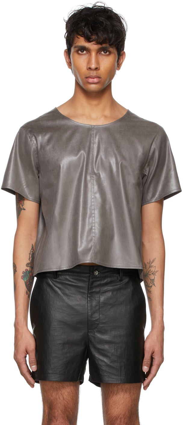 Short sleeve faux-leather T-shirt in grey. Distressing throughout. Crewneck collar. Central seam at front. Cropped hem. Self-tie straps at open back. Supplier color: Grey 100% polyester. Brand: Sean Suen
