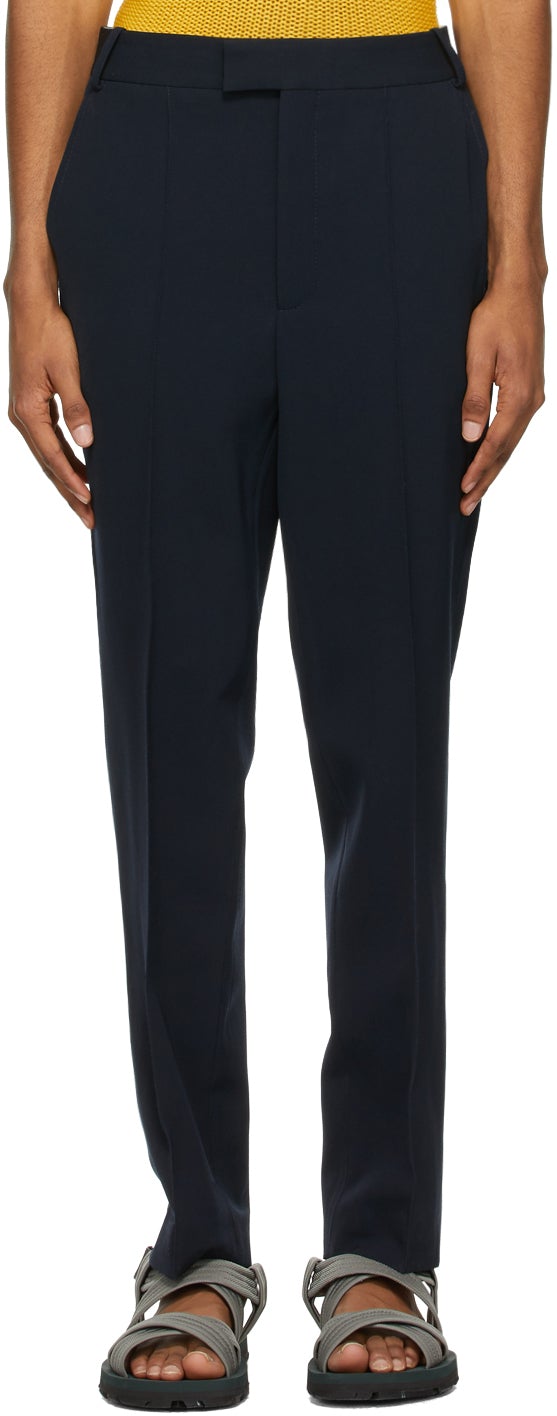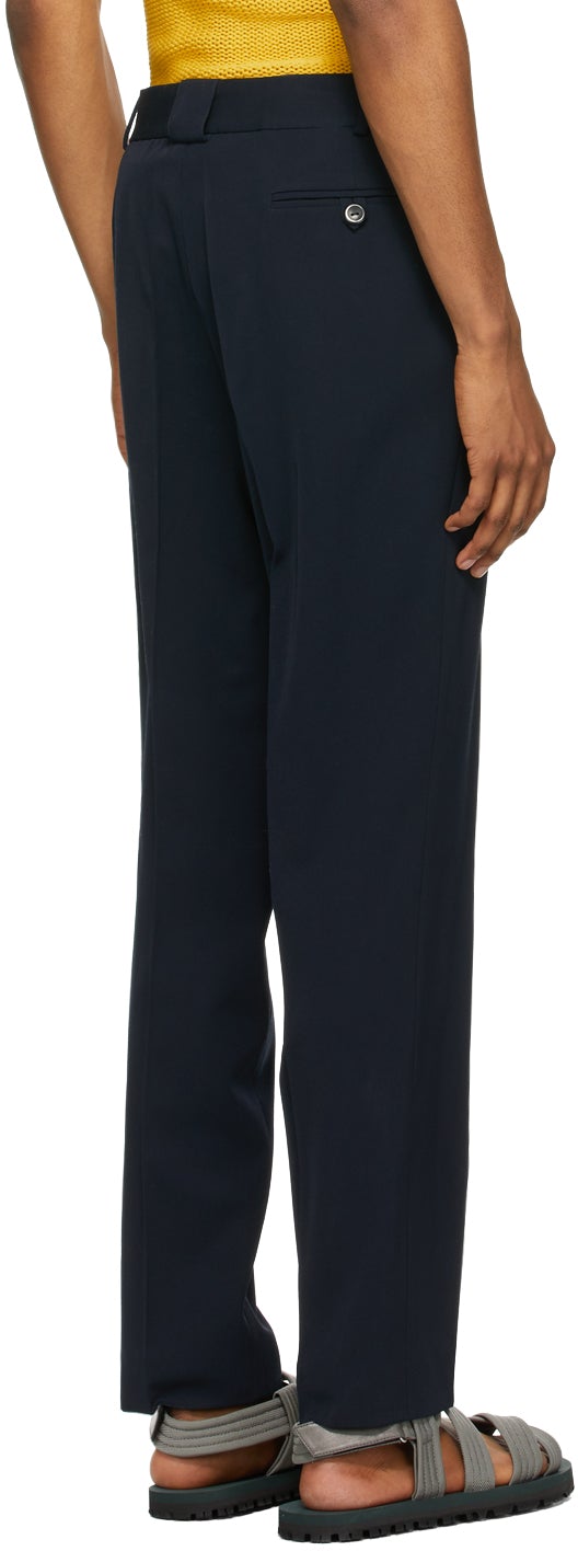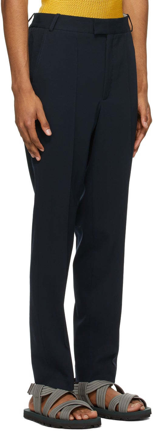 Straight-leg stretch wool-blend twill trousers in navy. Mid-rise. Three-pocket styling. Belt loops at waistband. Central pinched seam at front legs. Central pleat at back legs. Zip-fly. Tonal hardware. Supplier color: Dark blue 70% wool, 20% polyester, 10% elastane. Brand: Situationist