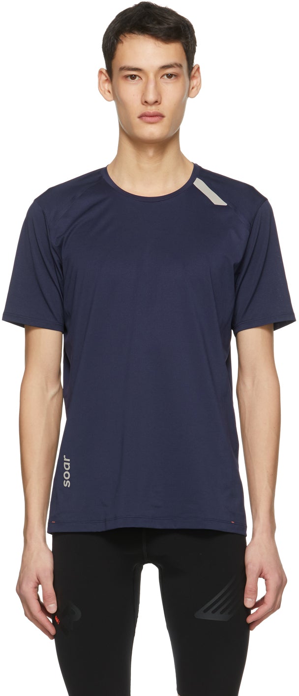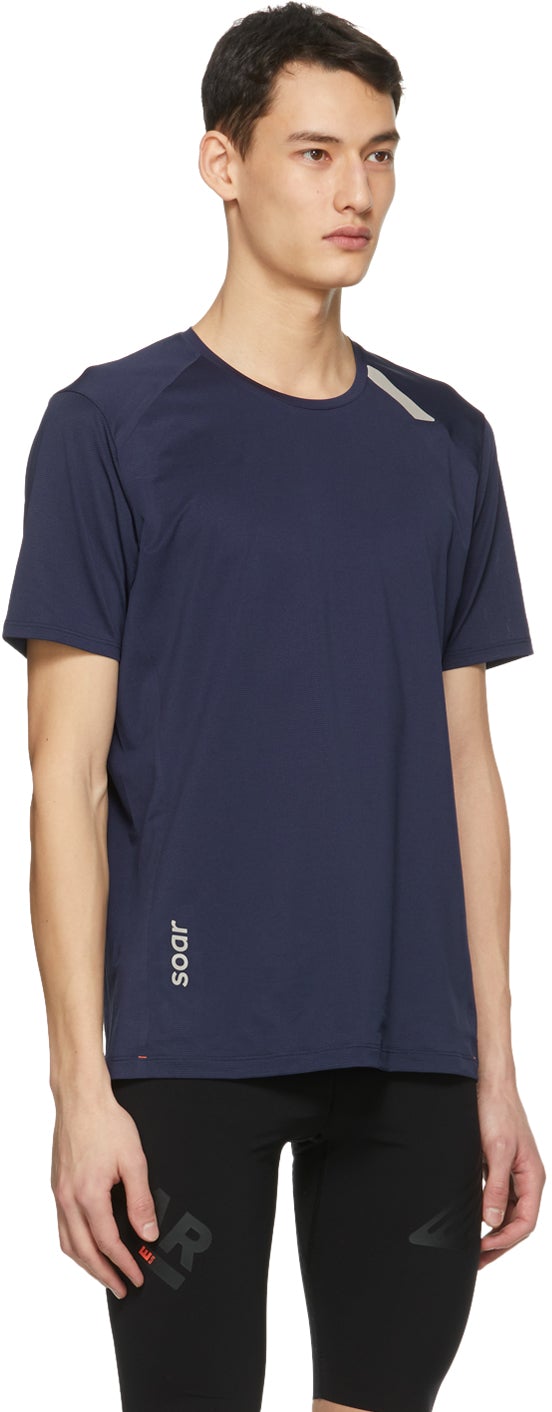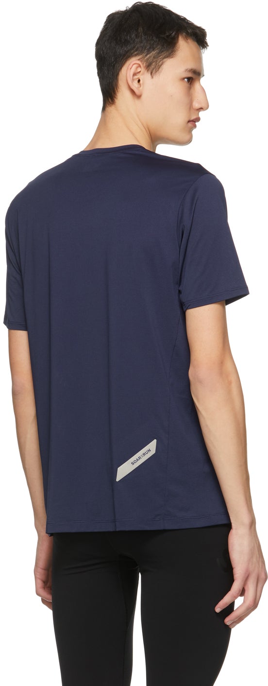 Short sleeve stretch Italian mesh T-shirt in indigo. Breathable and antibacterial. Bonded trim in reflective silver-tone at crewneck collar. Bonded logo in reflective silver-tone at front and back waist. Supplier color: Indigo 86% polyester, 14% elastane. Brand: Soar Running