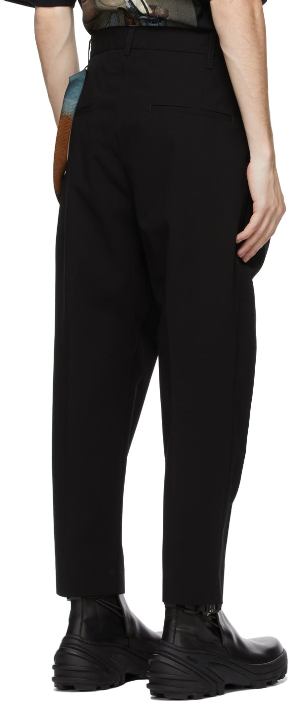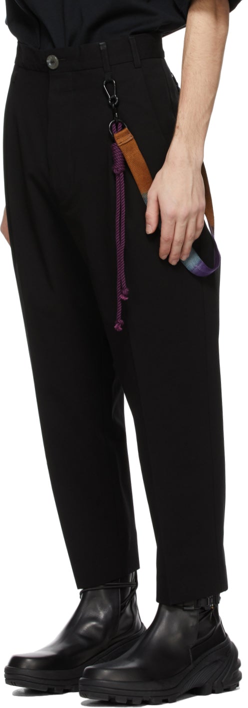Tapered cotton gabardine trousers in black. Mid-rise. Cropped leg. Four-pocket styling. Belt loops at waistband. Detachable webbing strap in multicolor with lanyard clasp fastening at waist. Pleats at front. Unlined. Button-fly. Logo-engraved grey and black hardware. Supplier color: Black 100% cotton. Brand: Song for the Mute