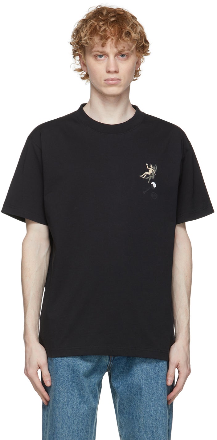Short sleeve organic cotton jersey T-shirt in black. Rib knit crewneck collar. Printed graphic in black, white, and tones of beige at chest. Printed graphics in grey at back. Supplier color: Black 100% organic cotton. Brand: Soulland
