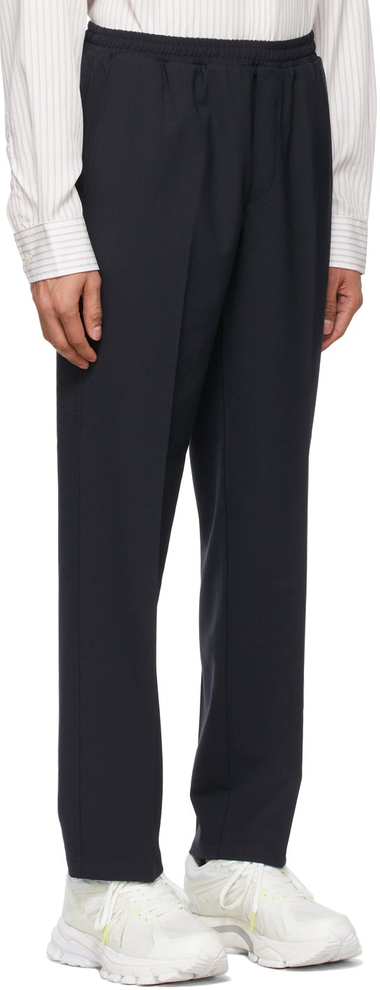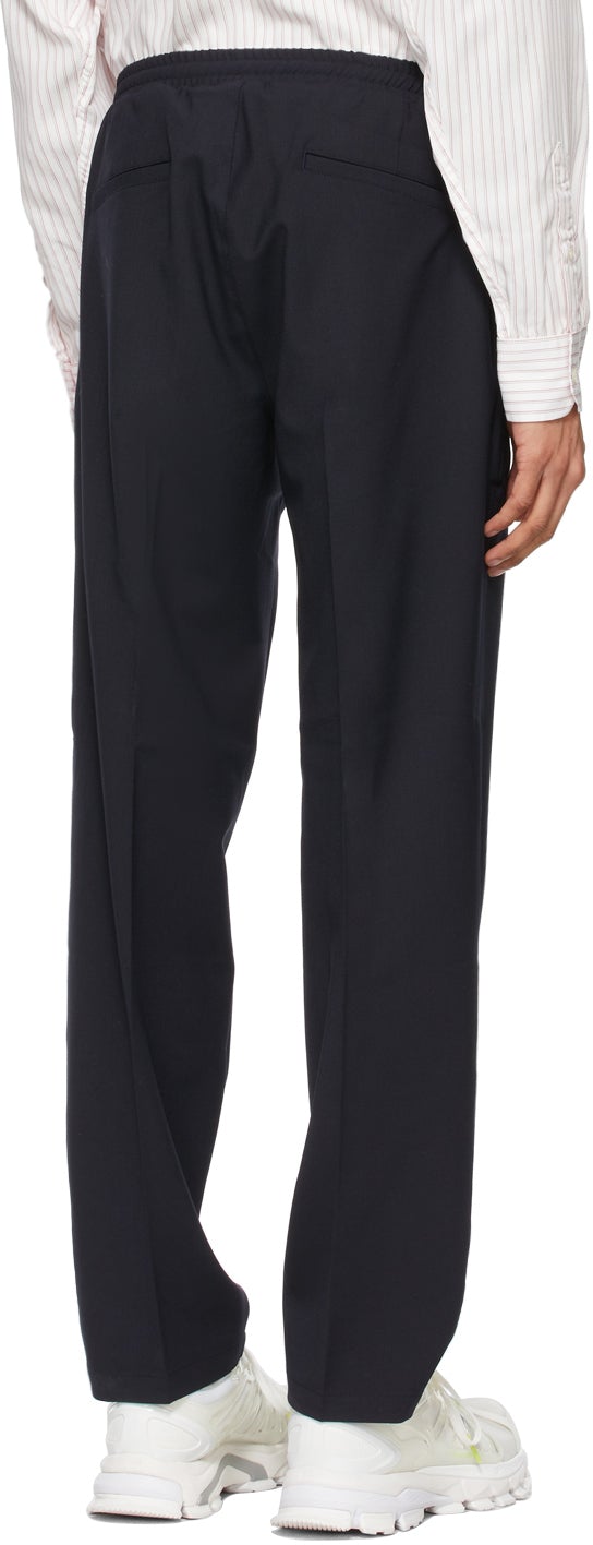 Straight-leg stretch recycled jersey and viscose-blend twill trousers in navy. Mid-rise. Four-pocket styling. Concealed drawstring at waistband. Central pleats at front and back. Mock fly. Supplier color: Navy 63% recycled polyester, 33% viscose, 4% elastane. Brand: Soulland