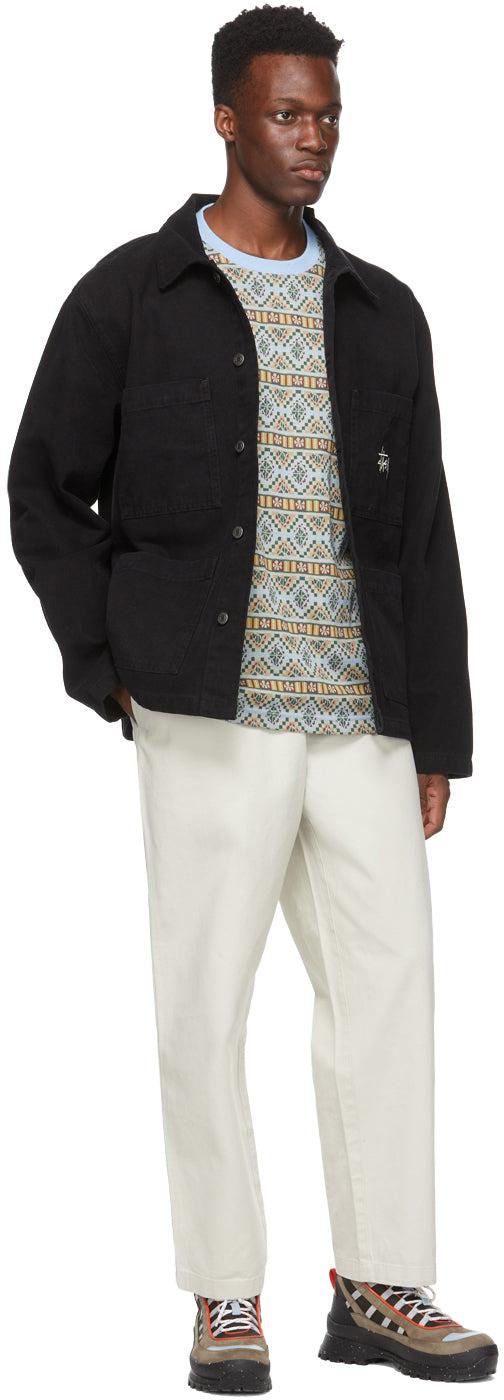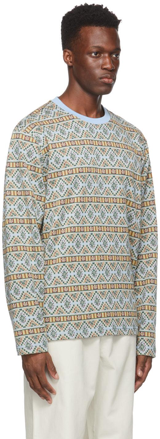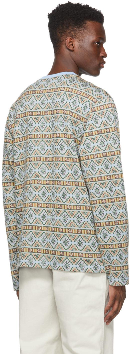 Long sleeve knit cotton T-shirt in blue featuring multicolor jacquard knit graphic pattern throughout. Rib knit crewneck collar. Textile logo patch in black at side-seam. Supplier color: Blue 100% cotton. Brand: Stüssy