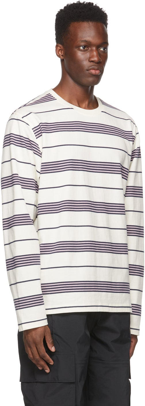 Long sleeve cotton jersey T-shirt in white featuring stripes in purple and black throughout. Rib knit crewneck collar. Textile logo patch in black at side-seam. Supplier color: Natural 100% cotton. Brand: Stüssy