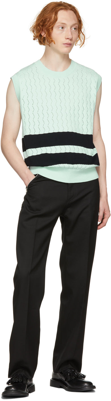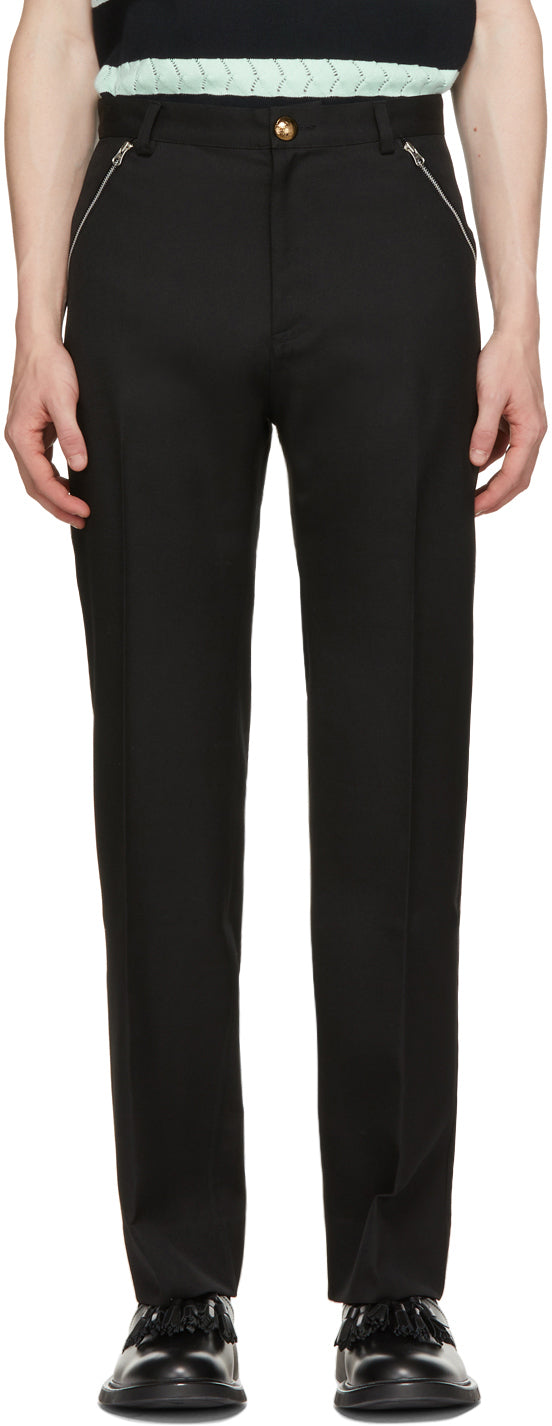 Straight-leg wool twill trousers in black. Mid-rise. Three-pocket styling. Belt loops at waistband. Central crease at front and back. Zip-fly. Gold-tone and silver-tone hardware. Supplier color: Black 100% wool. Brand: Stefan Cooke