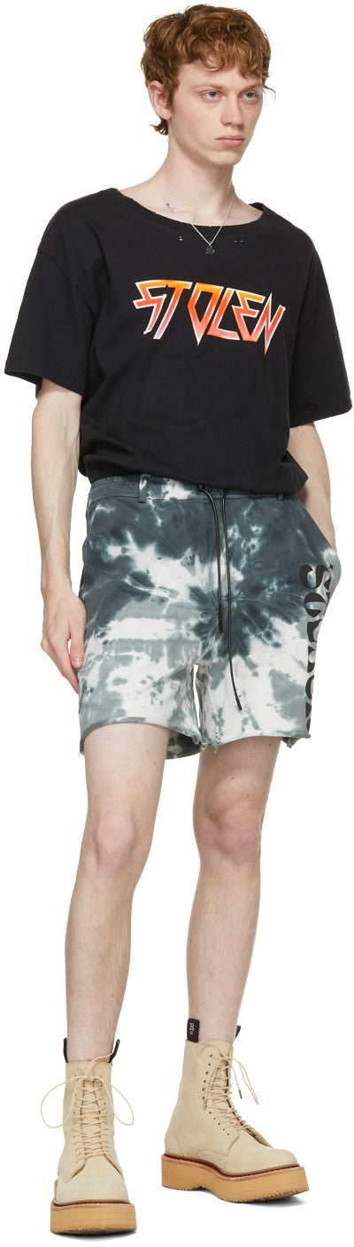 Short sleeve organic cotton jersey T-shirt in black. Distressing throughout. Rib knit crewneck collar. Printed logo featuring gradient pattern in tones of yellow, orange, and red at front. Tonal embroidered logo at cuff. Supplier color: Aged charcoal 100% organic cotton. Brand: Stolen Girlfriends Club