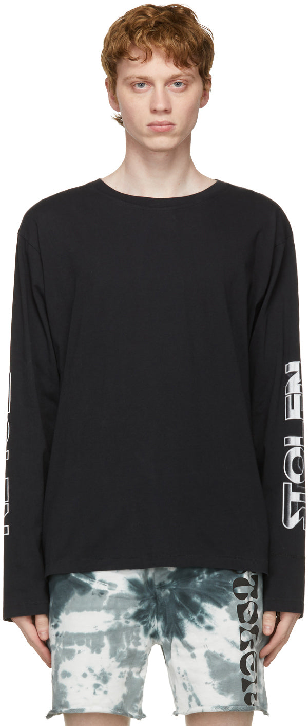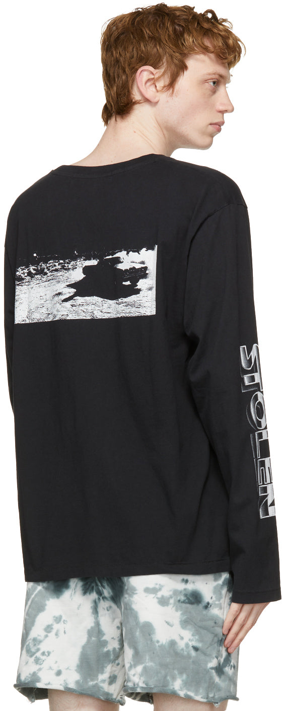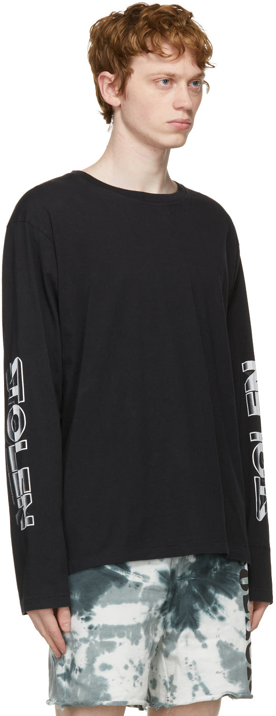Long sleeve organic cotton jersey T-shirt in black. Fading throughout. Rib knit crewneck collar. Logo printed in tones of grey at sleeves. Tonal embroidered logo at cuff. Graphic printed in grey at back. Supplier color: Aged charcoal 100% organic cotton. Brand: Stolen Girlfriends Club